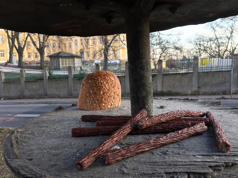 Na zdjęciu: Niepokruszony chleb i kabanosy w... karmniku dla ptaków. Zgroza...