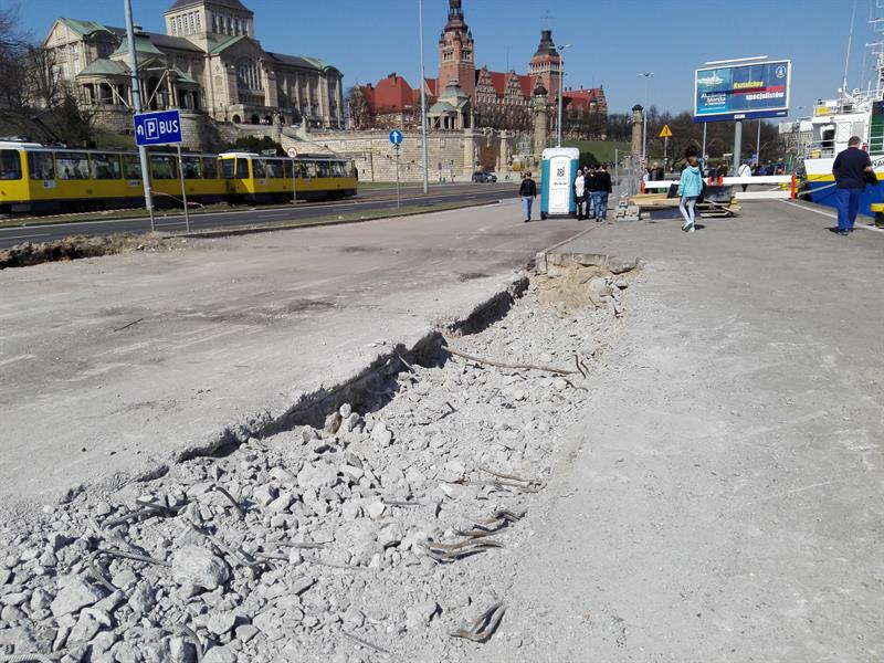Tak wygląda teren niczym niezabezpieczonej budowy, której inwestorem w imieniu miasta jest Zarząd Dróg i Transportu Miejskiego. Mowa o remoncie kapitalnym nitki Trasy Zamkowej, jaki codziennie mijają tysiące szczecinian i turystów, przemierzających nadodrzańskimi bulwarami szlak ku Wałom Chrobrego.
