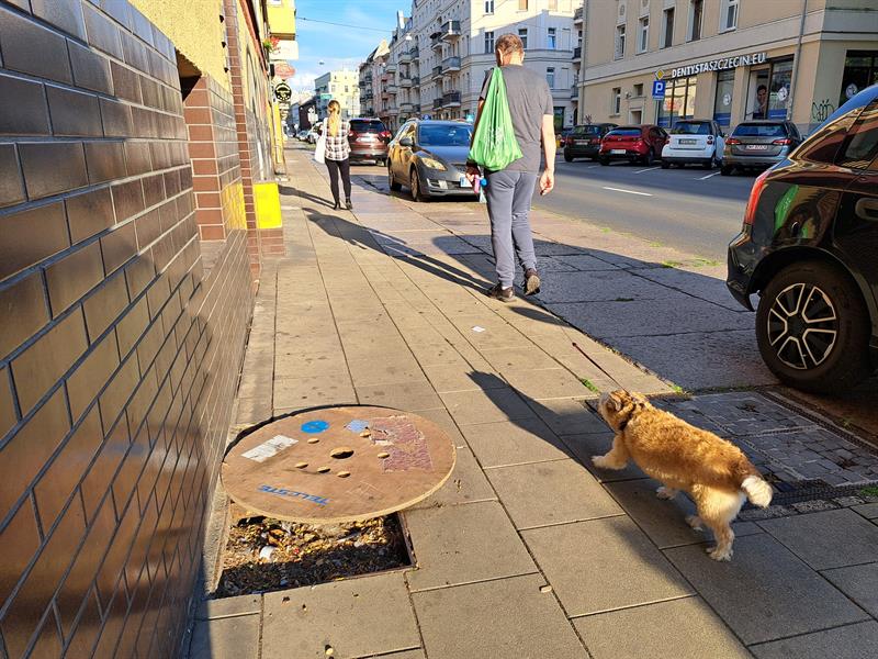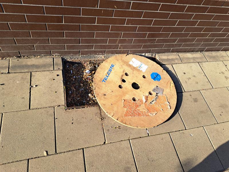 Właz od kilku tygodni pozostaje prowizorycznie zabezpieczony płytą wiórową w kształcie koła. Prawdopodobnie jest to fragment szpuli, na którą nawija się kable. Płyta nie jest w żaden sposób przytwierdzona do studzienki – po prostu leży na chodniku. Jest gruba, więc można się o nią łatwo potknąć. Za jakiś czas, kiedy spróchnieje, nie będzie stanowiła już żadnego zabezpieczenia.