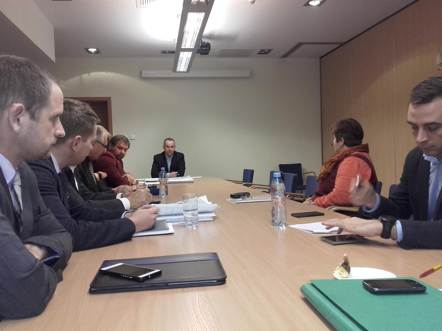 NZ: Przewodniczący Paweł Mucha (w szczycie stołu), zaproszeni goście i puste miejsca pozostałych radnych komisji rewizyjnej.