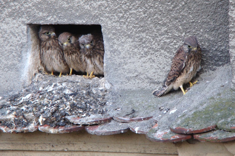Młode pustułki większość czasu spędzają na pobliskich dachach, gdzie mają najlepsze warunki do nauki latania.