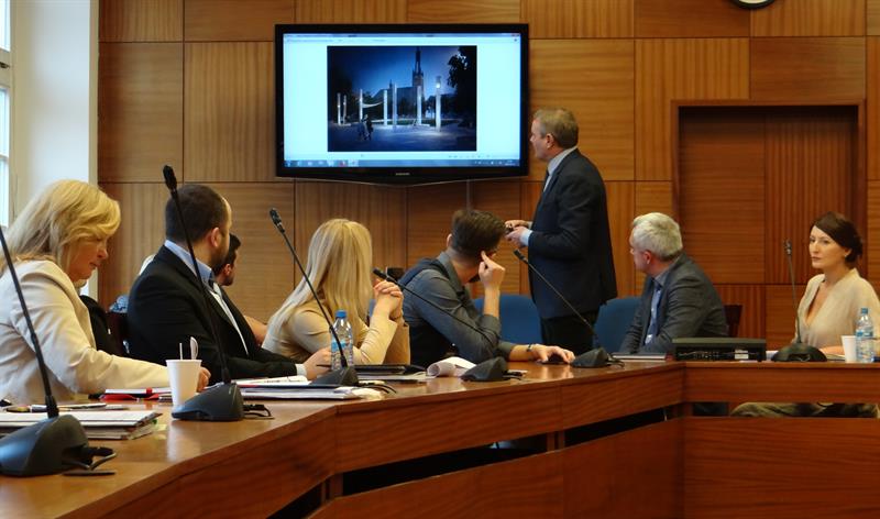 Podczas posiedzenia Komisji ds. Kultury zwycięską koncepcję dla pl. Orła Białego, opracowaną przez pracownię „Orłowski, Szymański - Architekci", przedstawił jej współautor Marek Orłowski. Zwracając uwagę na nawiązanie historyczne oraz współczesne sąsiedztwo z Akademią Sztuki, zajmującą Pałac „Pod Globusem". Stąd - jak tłumaczył - wydzielenie trzech przestrzeni funkcjonalnych i architektonicznych w całej przestrzeni współcześnie określanej jako pl. Orła Białego. Pusty plac wokół nieczynnej fontanny odzwierciedla przestrzeń, jaką faktyczny plac zajmował jeszcze przed wojną. Na jej granicy stanąć mają pylony, pomiędzy którymi będą eksponowane prace studentów Akademii. Część trzecią zajmuje trawnik wraz z okalającymi go drzewami - minipark na miejscu przedwojennej zabudowy. Natomiast „zmianą rewolucyjną w wymiarze komunikacyjnym" autor określił usunięcie parkingu z centrum placu. Co do pozostawionych blisko 100 miejsc parkingowych na obrzeżach, to… „Zrobiliśmy miejsca parkingowe, bo czuliśmy, że jest taka potrzeba" - jak przyznał współautor zwycięskiej koncepcji.