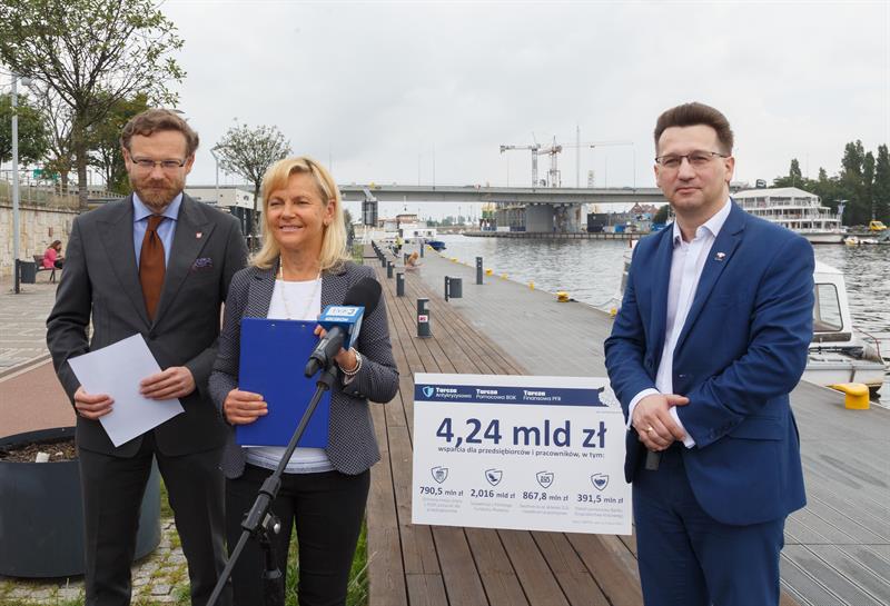 Na zdjęciu: Radni Zbigniew Bogucki, Małgorzata - Jacyna Witt i Ireneusz Rogowski opowiadali o działaniach rządu podczas konferencji na Nabrzeżu Wieleckim w Szczecinie.
