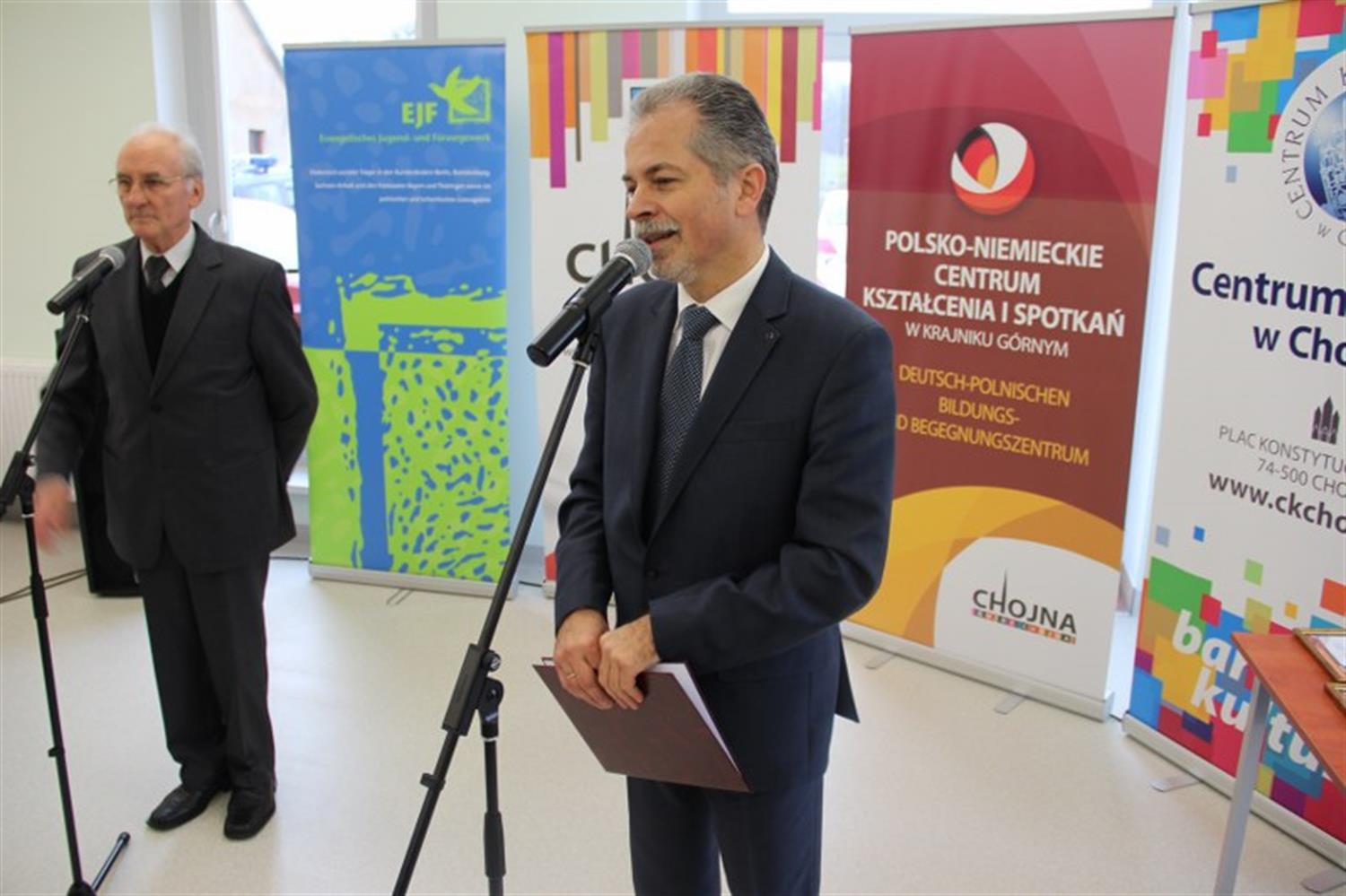 Rok 2014. Burmistrz Adam Fedorowicz (z prawej) w Polsko-Niemieckim Centrum Kształcenia i Spotkań w Krajniku Górnym