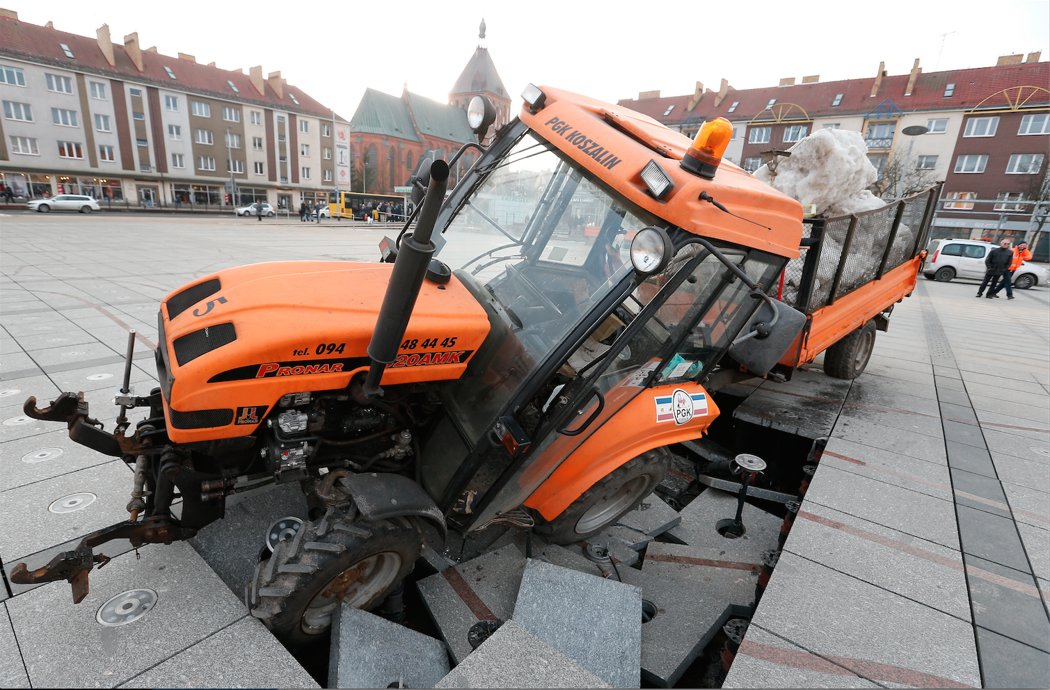 Pracownicy Przedsiębiorstwa Gospodarki Komunalnej sprzątali płac przed koszalińskim ratuszem. Gdy pojazd z przyczepą pełną śniegu ruszył przez miejsce nieczynnej zimą fontanny, to zawaliła się posadzka instalacji.