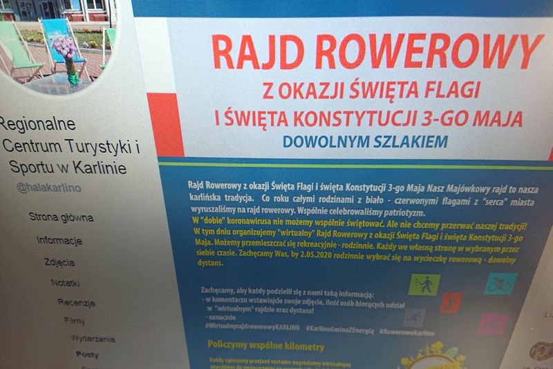 Rajd rowerowy, organizowany z okazji Święta Flagi i Konstytucji 3 Maja, jest wieloletnia tradycją Karlina. - Co roku całymi rodzinami z biało-czerwonymi flagami wyruszaliśmy w trasę. Wspólnie celebrowaliśmy patriotyzm – wspomina Magdalena Jaworska-Dużyńska z karlińskiego Urzędu Miejskiego. – W dobie koronawirusa nie możemy jednak wspólnie świętować.