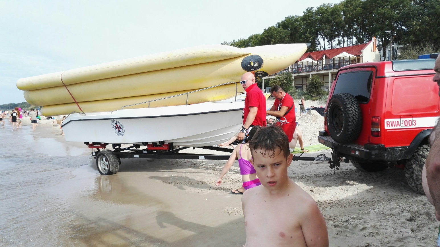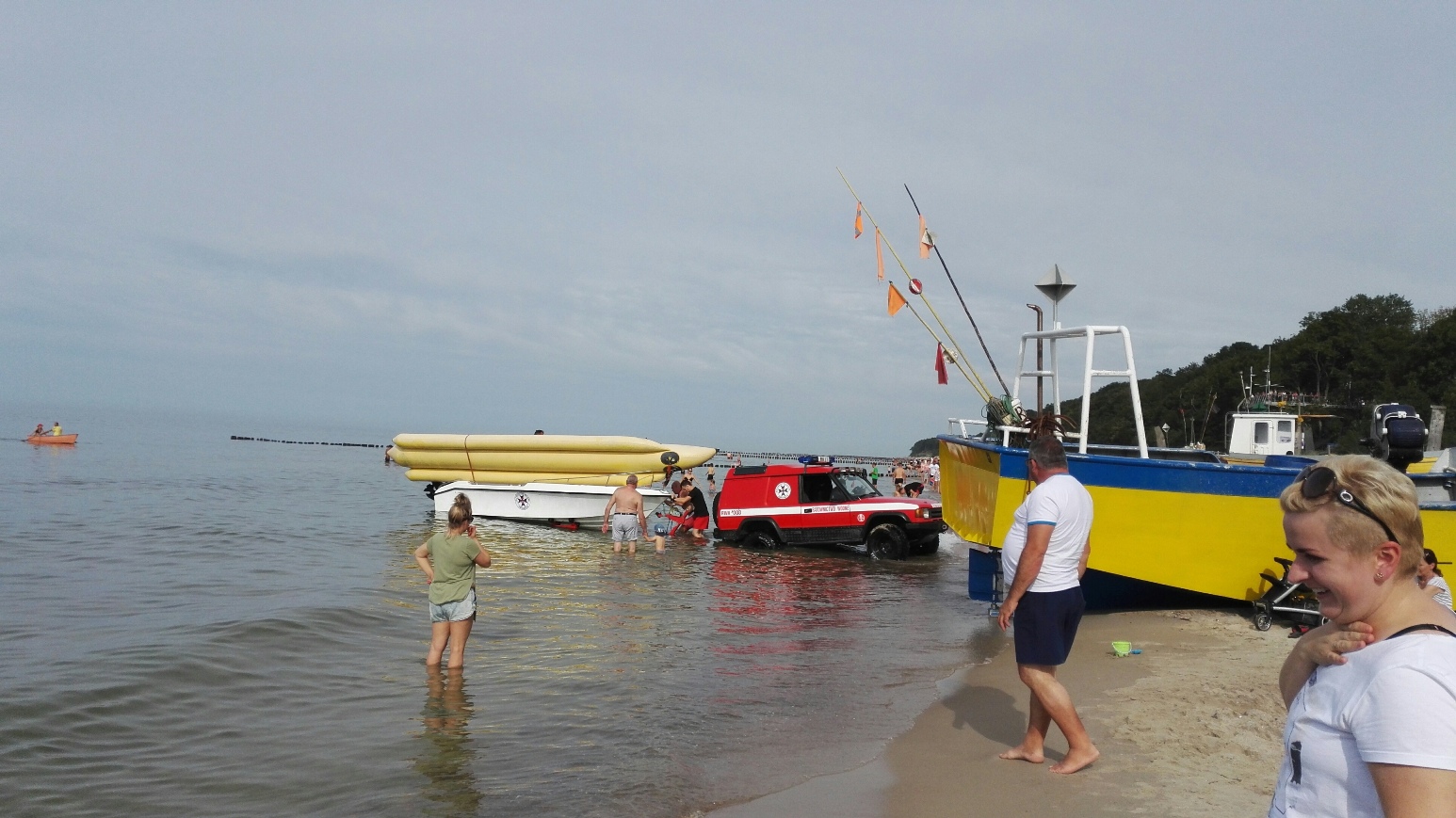 Jak widać na innym zdjęciu ratownicy z Sosnowca wyciągają z morza banana, na którym przez cały dzień wożą chętnych po morzu, oczywiście za opłatą. Tyle tylko, że na czas wyciągania i wjazdu auta do morza przeganiają turystów z plaży, co powoduje liczne konflikty. Bo nie każdemu chce się zwinąć parawan, zabrać koce i inne rzeczy, by panowie ratownicy mogli zabrać swoje „zabawki”. Wszak mogą banana wodować w innym miejscu, ale widać, że oszczędzają paliwo. Pytanie kolejne: czy wjeżdżający do morza samochód nie zanieczyszcza wody?