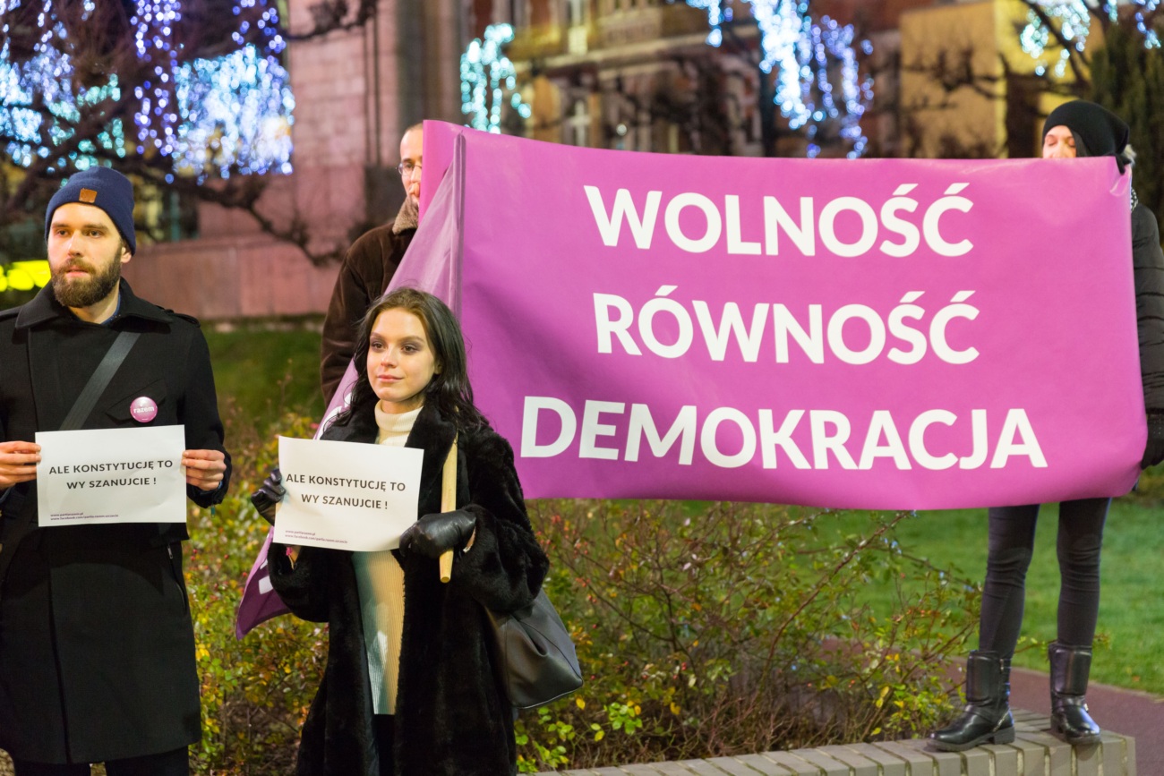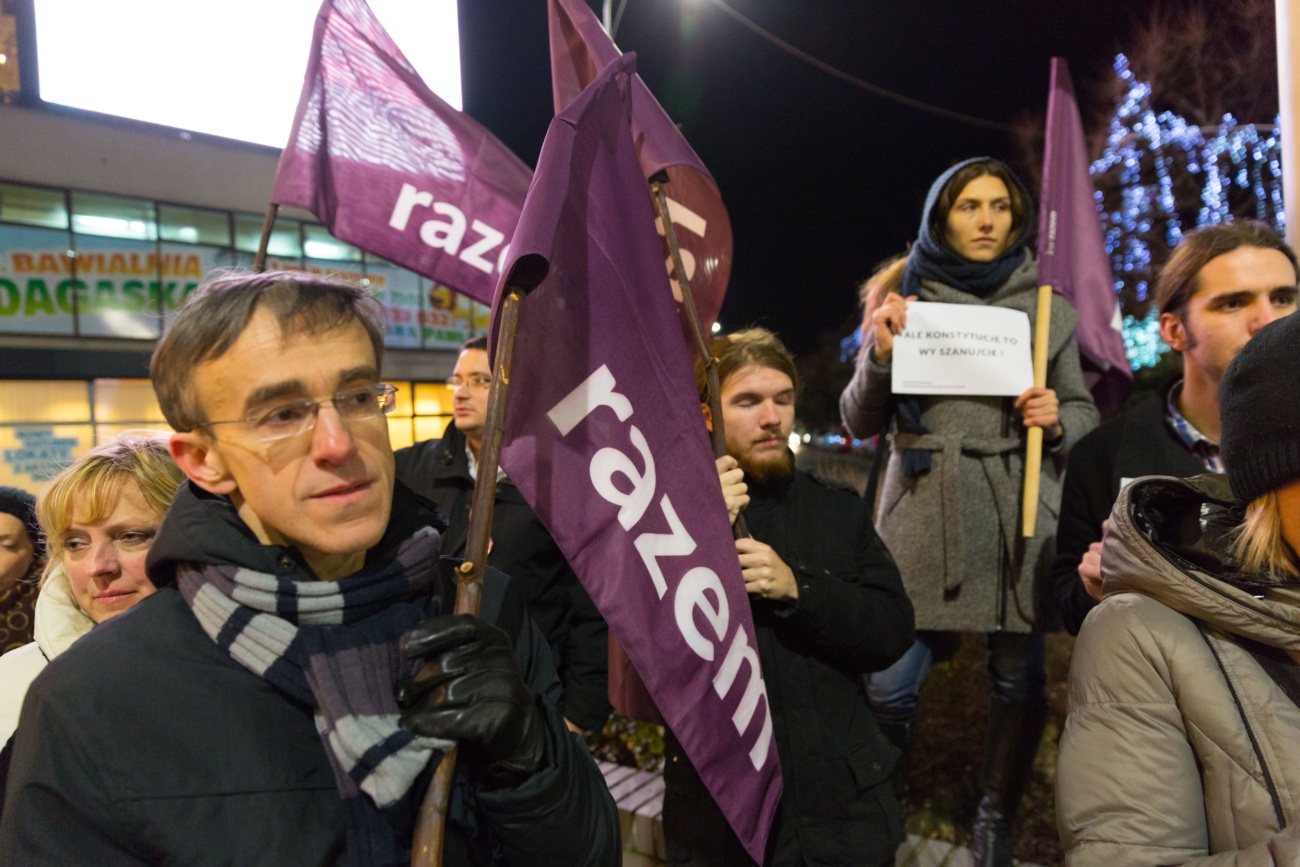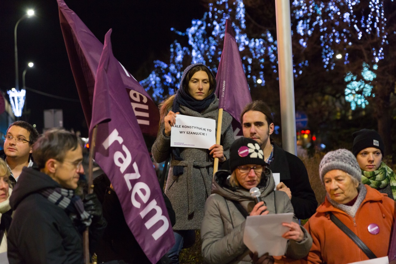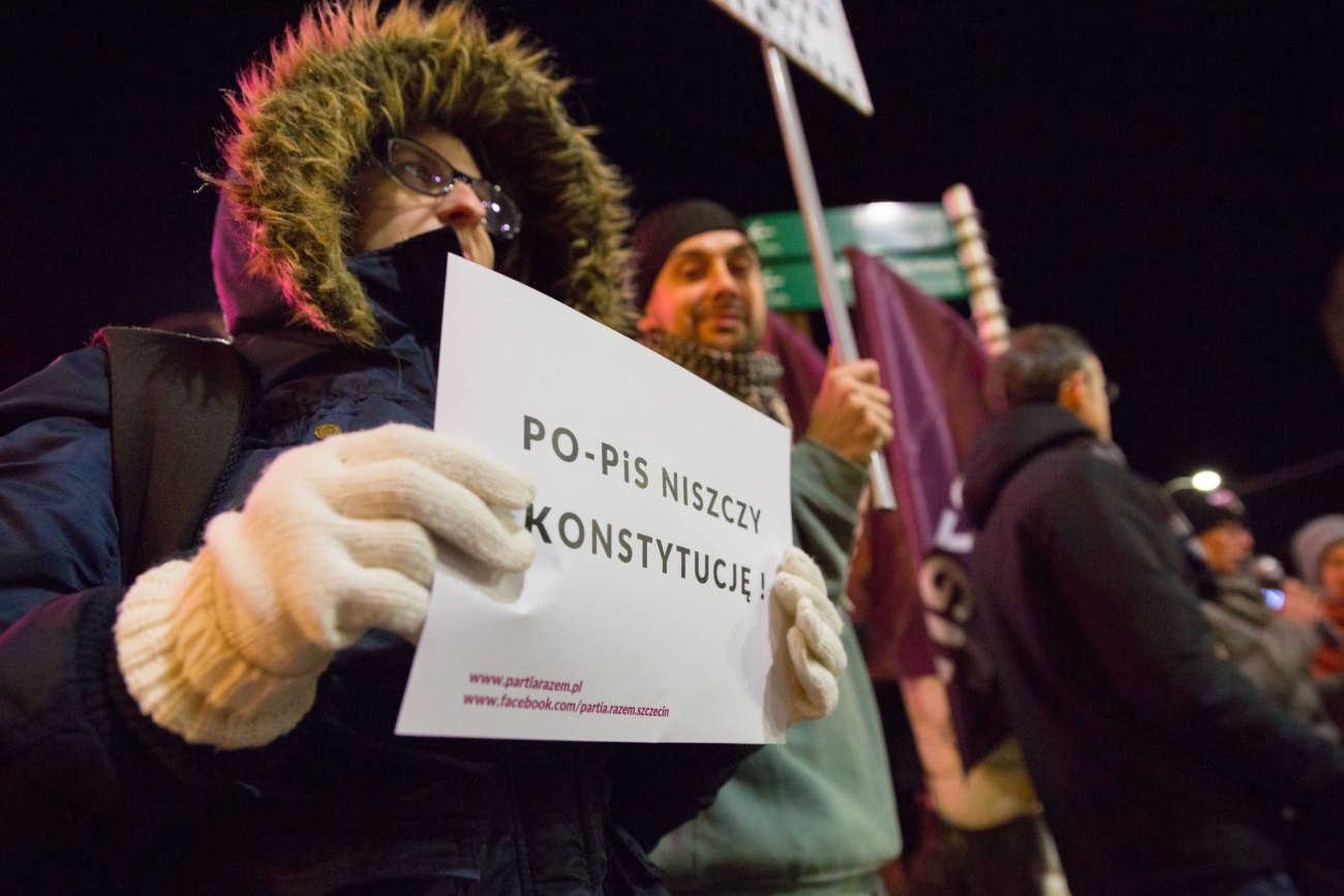Stop łamaniu konstytucji! Wolność, równość, konstytucja! Hasła te skandowała grupa lewicowych działaczy Partii Razem. Wieczorna manifestacja w sąsiedztwie szczecińskiej Kaskady, była wyrazem ich dezaprobaty wobec zamieszania z obsadą stanowisk sędziowskich w Trybynale Konstytucyjnym. Partii Razem nie podoba się ani zachowanie polityków PO i PiS, ani decyzje, które podjął w tej sprawie prezydent Andrzej Duda.