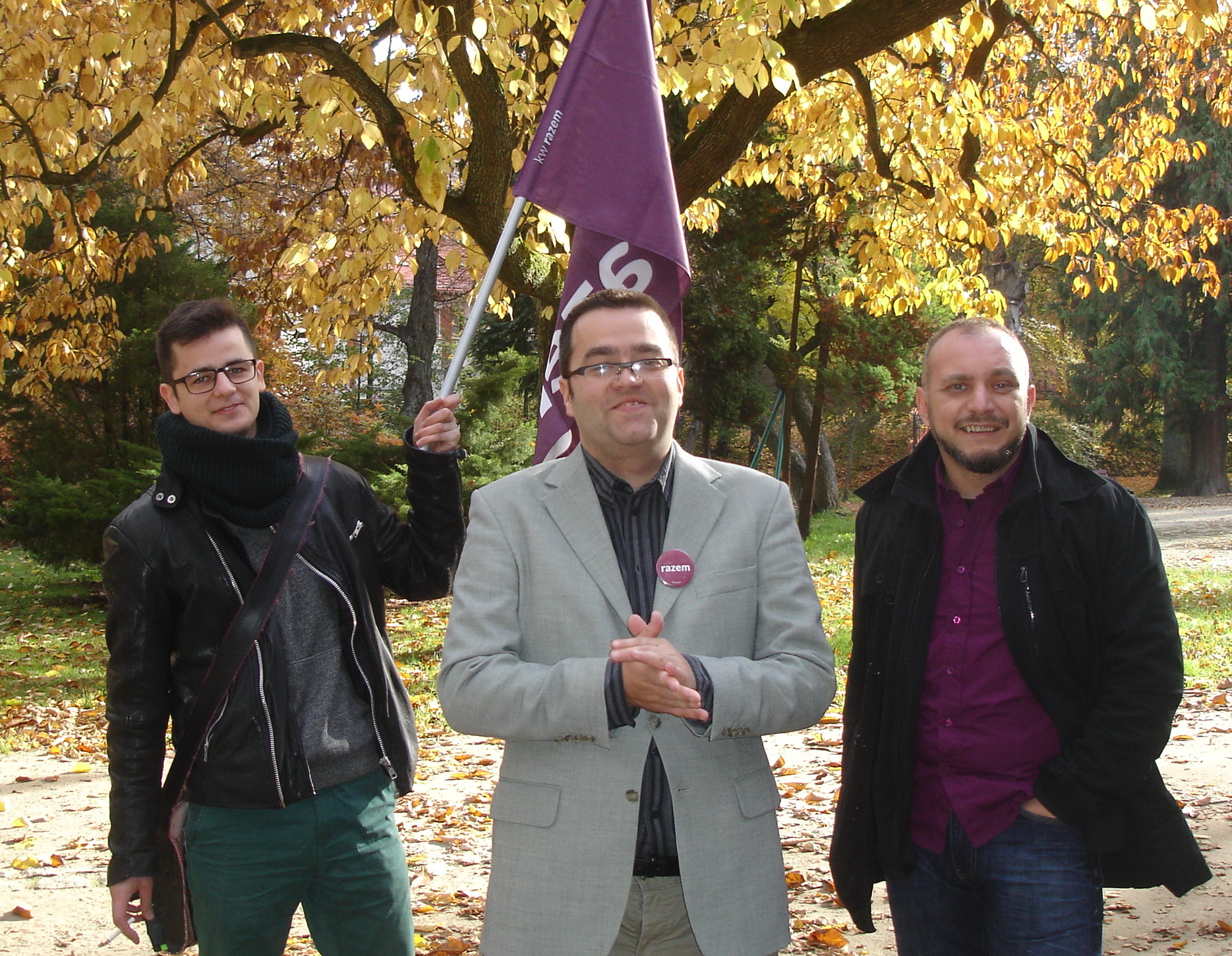 - Jest nas na spotkaniu w parku tylko trzech, bo pozostali pracują - powiedział Dominik Safian (z prawej). Obok stoją: Jacek Wezgraj i Michał Kaczmarek (z flagą).