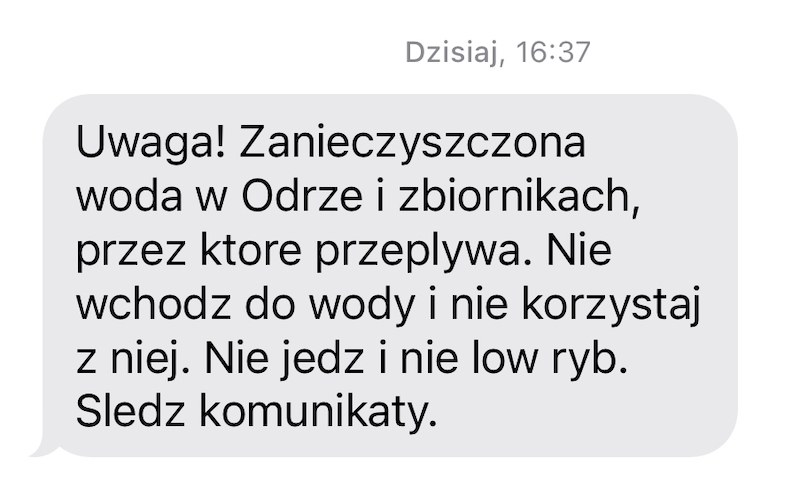 "Uwaga! Zanieczyszczona woda w Odrze i zbiornikach, przez które przepływa. Nie wchodź do wody i nie korzystaj z niej. Nie jedz i nie łów ryb. Śledź komunikaty" - poinformowano w wiadomości tekstowej.