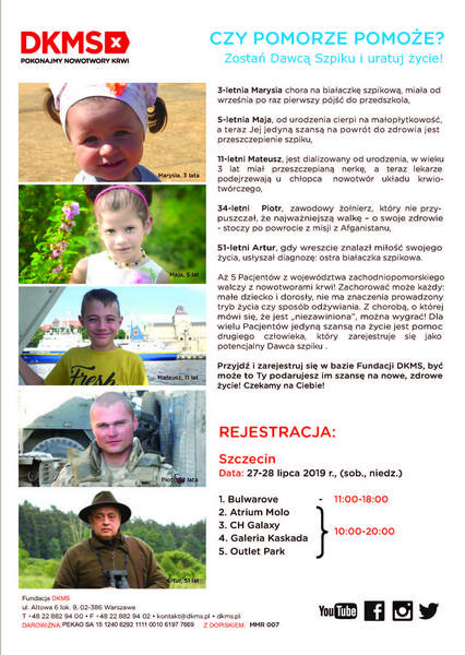 Marysia ma trzy lata i we wrześniu miała iść po raz pierwszy do przedszkola. Na początku czerwca okazało się, że dziewczynka choruje na ostrą białaczkę szpikową. Maja od urodzenia cierpi na małopłytkowość, która miesiąc temu przeszła w ostrą białaczkę szpikową. Mateusz w wieku 2 lat przeszedł przeszczep nerek. W marcu tego roku postawiono mu wstępną diagnozę - nowotwór krwi. Piotr to 34-letni żołnierz zawodowy. Po powrocie z misji zdiagnozowano u niego ostrą białaczkę limfoblastyczną. Artur w wieku 51 lat spotkał miłość swojego życia, niestety latem ubiegłego roku zdiagnozowano u niego ostrą białaczkę szpikową. Wszyscy chorują na nowotwory krwi, których leczenie wymaga lub będzie wymagało przeszczepienia od dawcy niespokrewnionego.