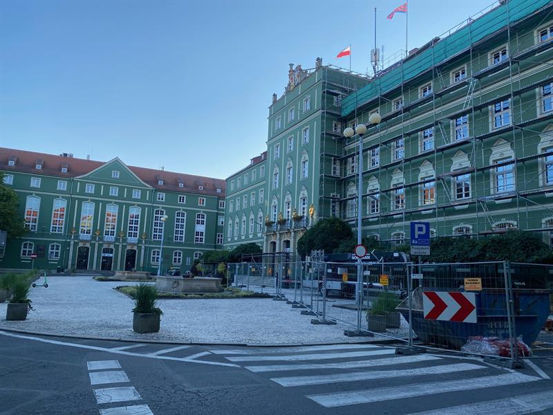 Budowlane rusztowania stanęły kilka tygodni temu przy szczecińskim magistracie, na części budynku nie ma też dachu. Prace obejmą tylko środkową część budynku.