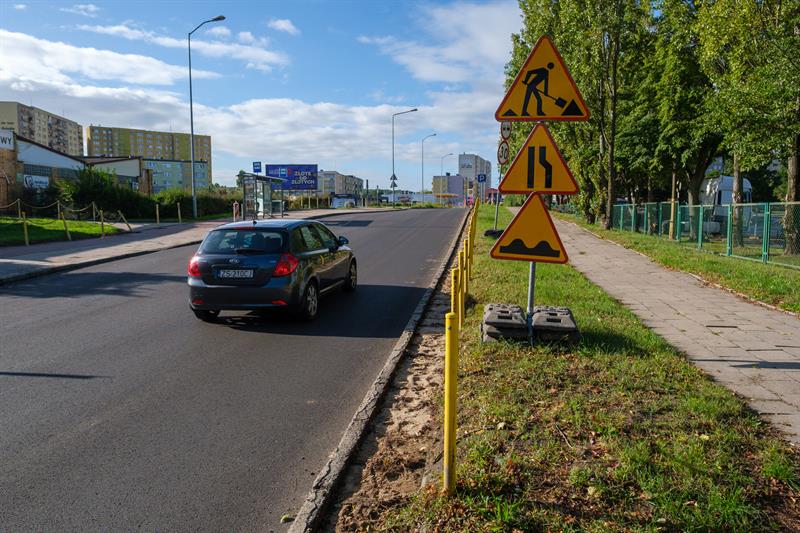 Nowa nawierzchnia asfaltowa jest już ułożona, a jezdnia zyskała równą i wygodną powierzchnię. Obecnie trwają prace wykończeniowe – wzdłuż drogi montowane są krawężniki, ustawiane jest oznakowanie pionowe i prowadzone są prace porządkowe. Wciąż jednak nie wykonano oznakowania poziomego, w tym pasów ruchu i przejść dla pieszych.