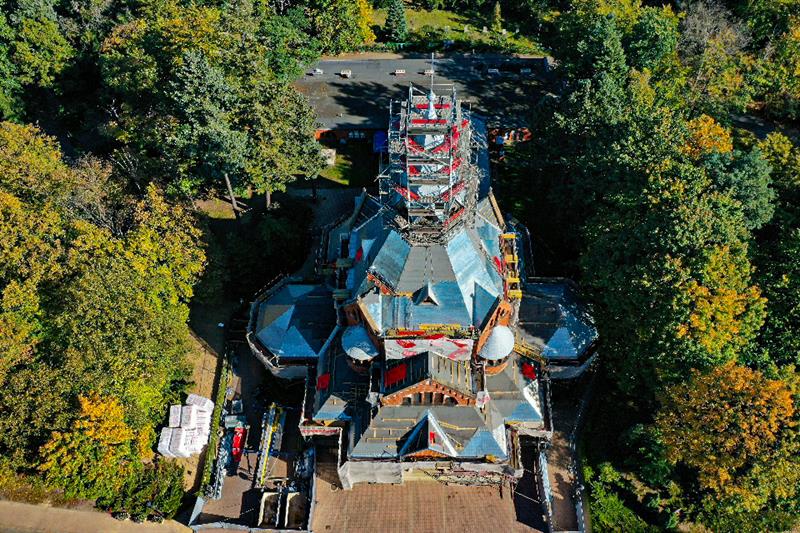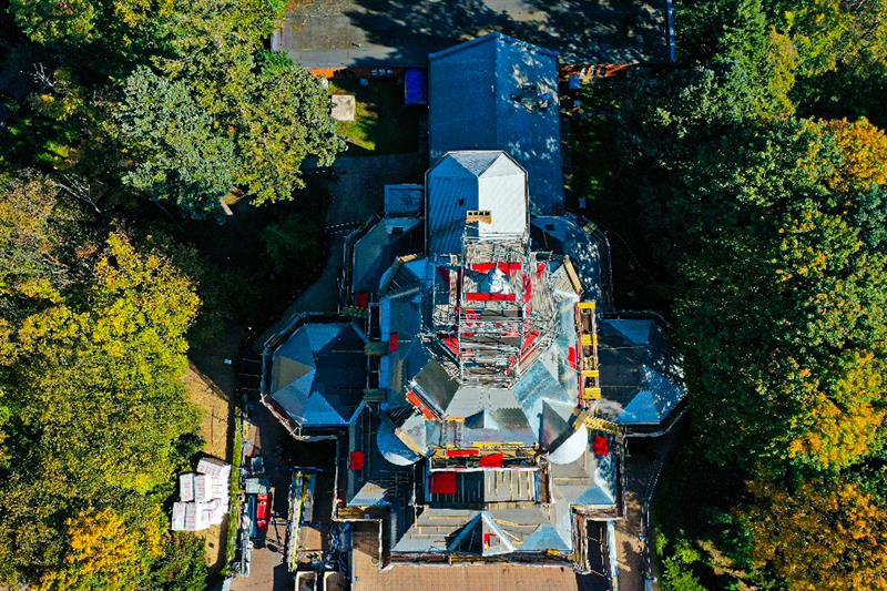 Prace przebiegają pod nadzorem Wojewódzkiego Konserwatora Zabytków. Do tej pory zostało zdjęte niemal całe stare poszycie dachu. Zastąpi je ułożona w systemie łusek rombowych blacha cynkowo-tytanowa.