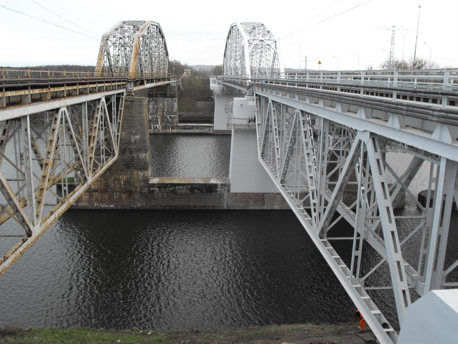 Dwa mosty stalowe kratownicowe, każdy z nich ma oddzielny tor, nad Odrą Zachodnią znajdują się na szlaku nr 351 Poznań Główny - Szczecin Główny. Tor nr 1 został zbudowany w r.1955, zaś nr 2 przed 46 laty. Obie konstrukcje znajdują się w sąsiedztwie mostu Pomorzan.