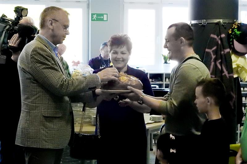 Nowych mieszkańców przywitano chlebem, solą i… słodkościami. Fot. UM Karlino