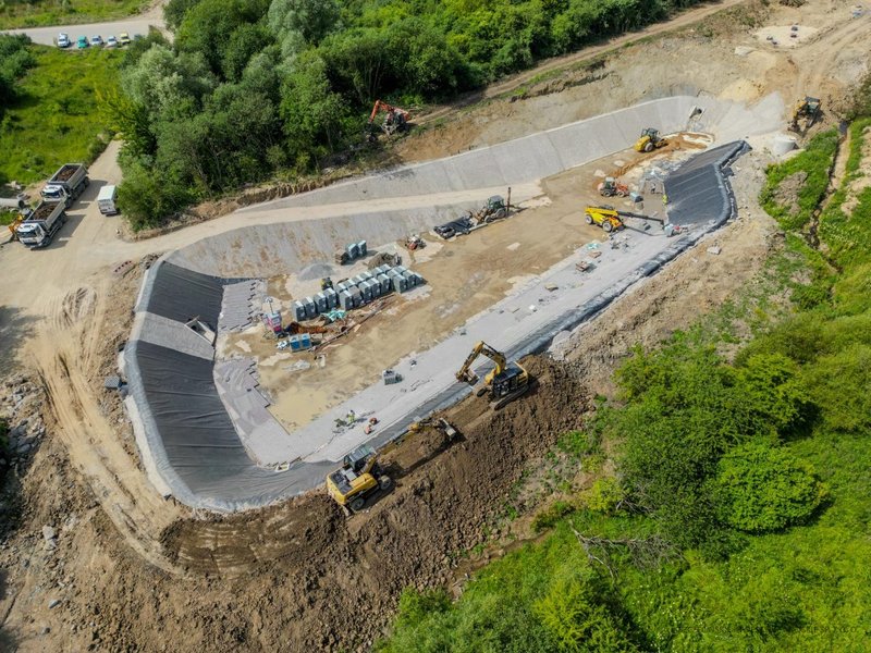 Prace skupiają się aktualnie na zabezpieczaniu skarp oraz dna zbiornika betonowymi płytami ażurowymi. Jednocześnie realizowane są roboty wokół zbiornika. Trwa wykonywanie nawierzchni dróg dojazdowych z płyt betonowych. Wkrótce rozpocznie się montaż słupów oświetleniowych.