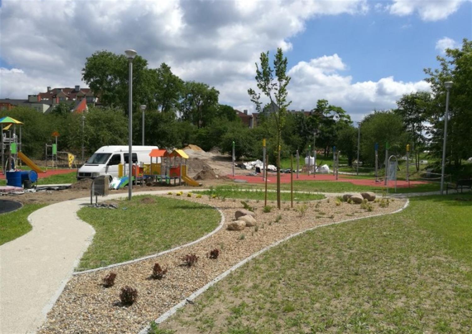 Praca wre. Są układane alejki z kostki brukowej oraz z mineralnej nawierzchni Hansa Grande. Tworzone tzw. bezpieczne place zabaw, a także ustawiane elementy małej architektury, jak np. ławki. Trwa montaż lamp, bo park będzie oświetlony. Poza tym robi się zielono.
