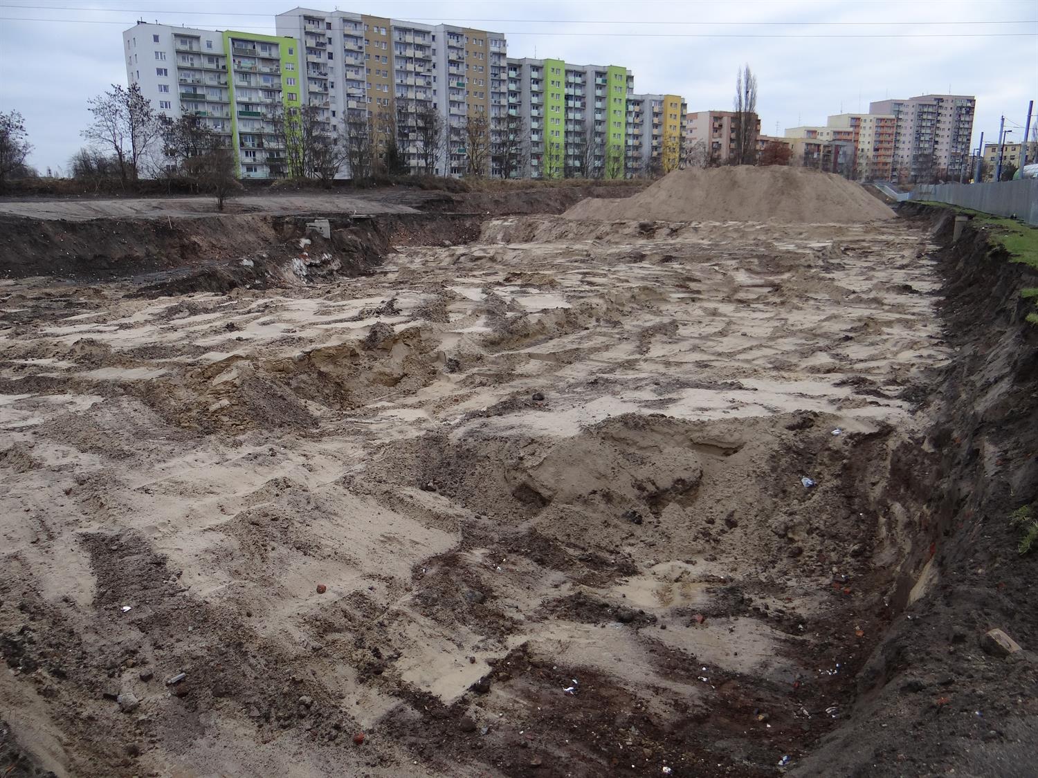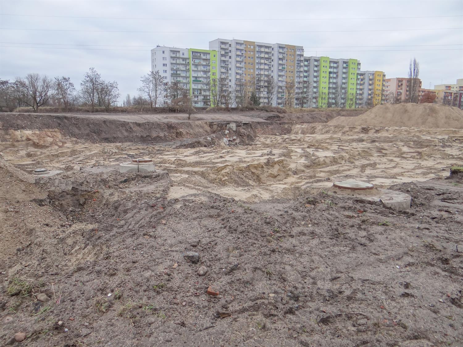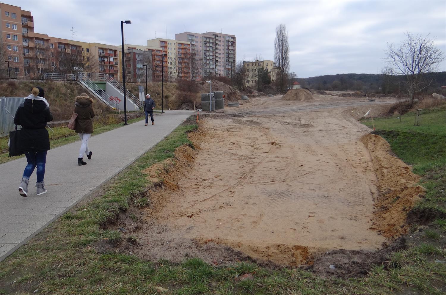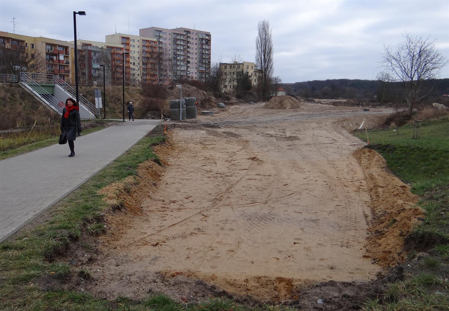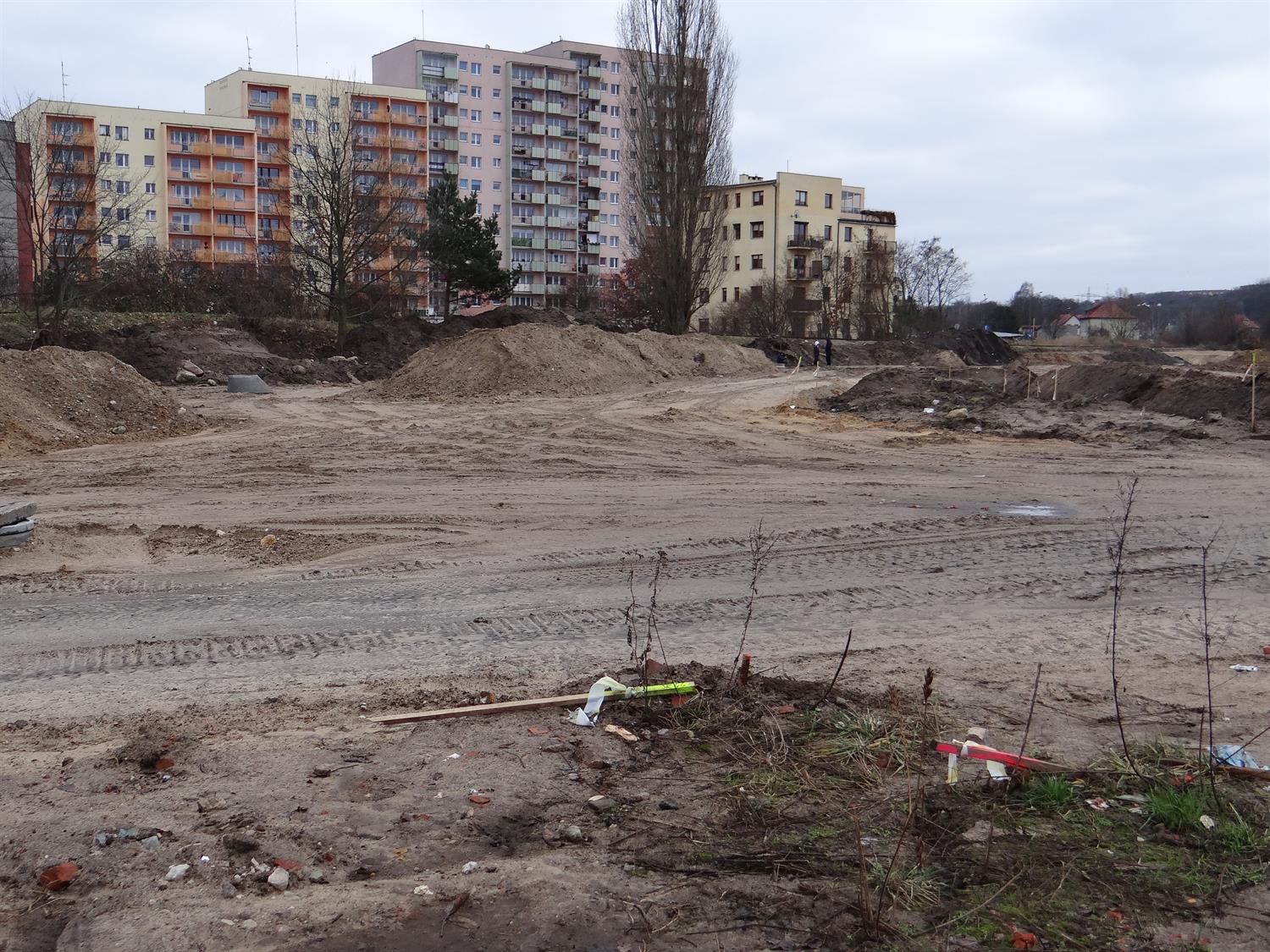 Trwają roboty ziemne za pętlą tramwajów na prawobrzeżu, między ulicą i bocznicą kolejową, przyległą do osiedla Słonecznego nieopodal bloków przy ulicach Rubinowej, Turkusowej, Jasnej i Przelotowej. Grunty nieużytków przygotowywane są pod budowę dróg dojazdowych i peronów z przystankami dla miejskich autobusów, mających być częścią nowego węzła przesiadkowego komunikacji miejskiej na styku osiedli Zdroje i Słoneczne.