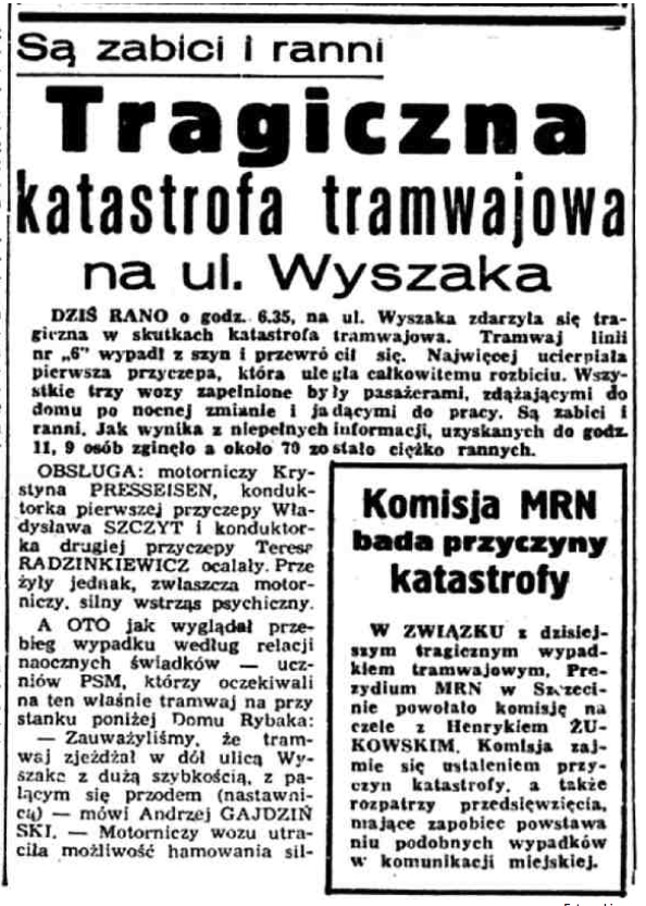 Zginęło 15 osób, 42 zostały ciężko ranne, ok. 100 odniosło lżejsze obrażenia. To była chyba największa katastrofa w historii polskiej komunikacji miejskiej. Doszło do niej 7 grudnia 1967 r. w Szczecinie, na nieistniejącej już dziś ul. Wyszaka. I choć od tragedii mija równo 50 lat, wydaje się, że w świadomości szczecinian całkiem się zatarła...