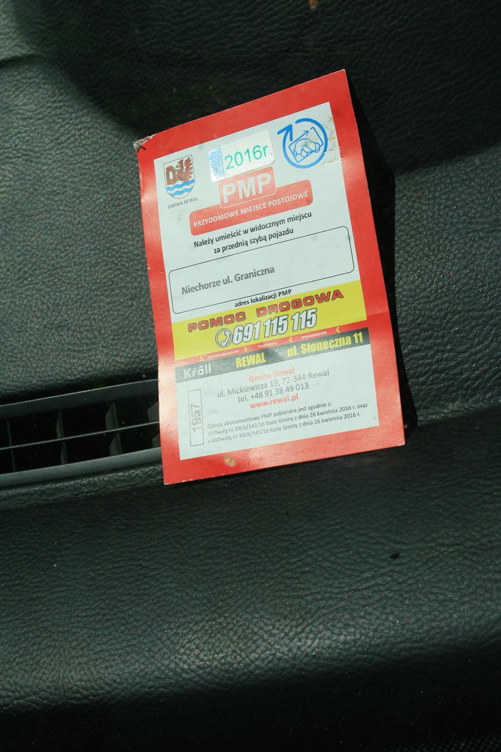 Zgodnie z uchwałą radnych wprowadzono opłatę abonamentową PMP, czyli tzw. przydomowe miejsce postojowe dla miejsc zlokalizowanych w sąsiedztwie posesji zabudowanej w miejscach wyznaczonych i określonych przez pracowników Urzędu Gminy Rewal. Mówiąc po prostu: gość, który wynajmuje prywatną kwaterę, musi parkować przed nią, a jej właściciel musi mu zapewnić widoczną na zdjęciu kartę PMP, którą trzeba położyć za szybą parkującego auta przed wynajmowanym pensjonatem. Karta kosztuje 135 zł za rok i „winna zawierać nazwę obiektu wraz z adresem, okres obowiązywania karty, oraz pouczenie o sposobie oznakowania przydomowego miejsca parkingowego”. Po co na cały rok, skoro strefa płatnego parkowania obowiązuje w gminie od 1 czerwca do połowy września? Radni tego nie zauważyli, chociaż w jednym dniu wydali dwie uchwały w tej sprawie.