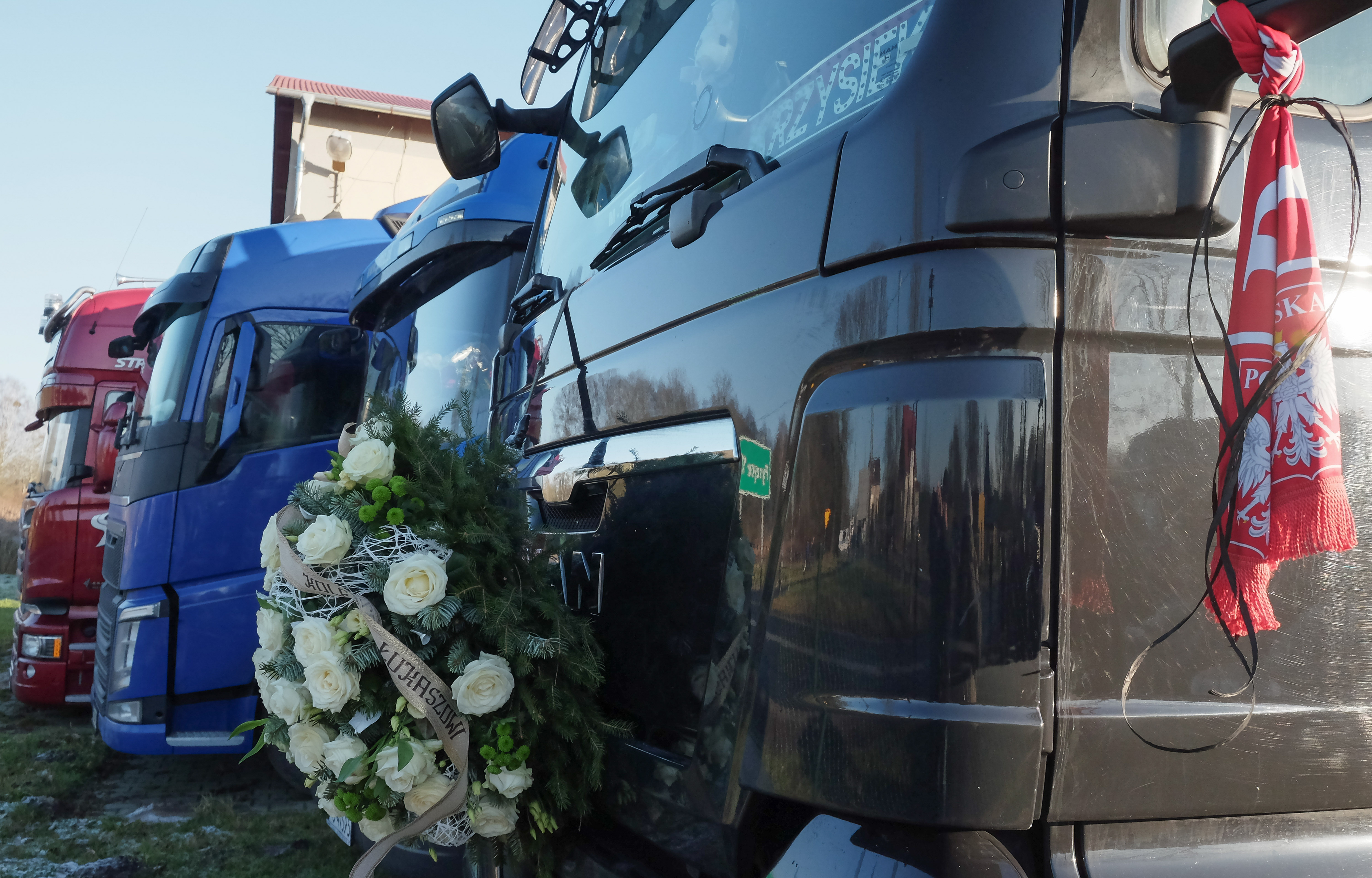 Na zdjęciu: W dniu pogrzebu Łukasza Urbana wieńcami kwiatów upamiętniali go m.in. inni kierowcy ciężarówek z jego rodzinnej miejscowości.
