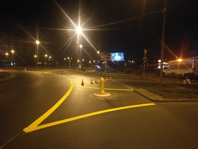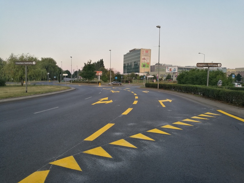 Bardzo dobry pomysł - prawy pas tylko dla zjeżdżających z ronda. Bedzie też można legalnie zjechać z ronda pasem środkowym. W sumie powinno to zwiększyć przepustowość ronda. Brawo dla organizatorów ruchu drogowego.