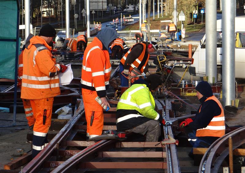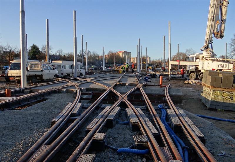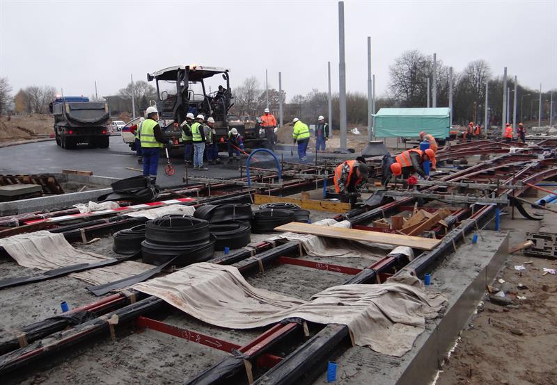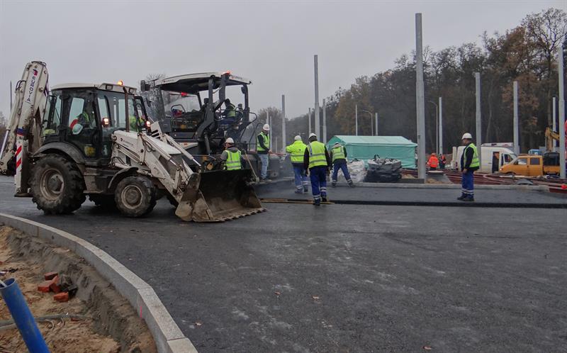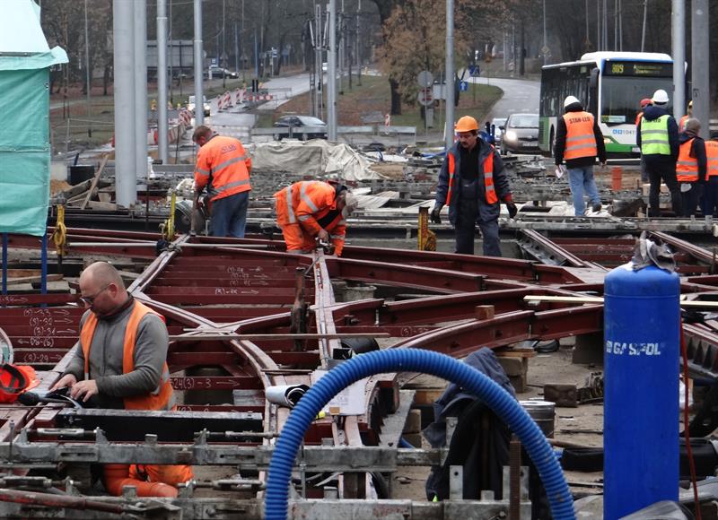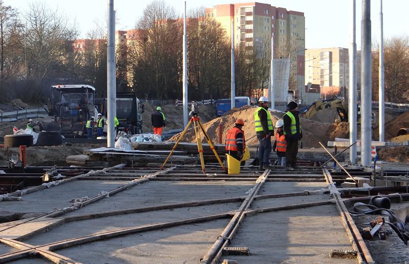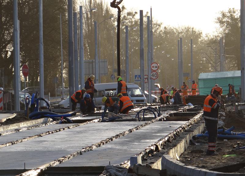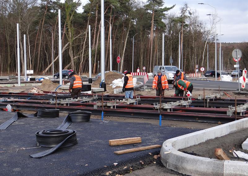 Na centralnej wyspie ronda przy montażu elementów rozjazdu ze zwrotnicami, w pasie nowego torowiska uwija się każdego dnia od świtu do zmierzchu po kilkudziesięciu robotników kilku firm podwykonawczych zatrudnionych przez Eurovię. Wśród nich są: Stanled ze Stargardu, Elektroline a.s., PKP Energetyka czy Lubcon Polska ze Świdnika, specjalizująca się w smarach i technikach smarowania. W ubiegłym tygodniu rozpoczął się montaż opraw na szczytach części słupów latarni w obrębie ronda. Te prace wykonała spółka Irel. Cały czas na placu budowy obecni są również geodeci ze szczecińskiej firmy Geototal.