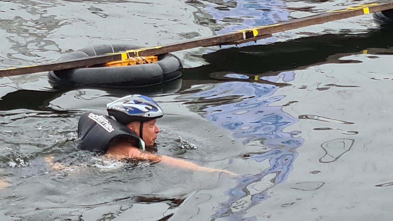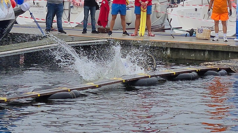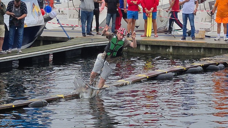 Zadanie nie było łatwe, gdyż zawodnicy musieli pokonać dystans 21 metrów po wąskich deskach rozłożonych na pływających w wodzie dętkach. Najczęściej spadali z tej niestabilnej konstrukcji już po kilku metrach.