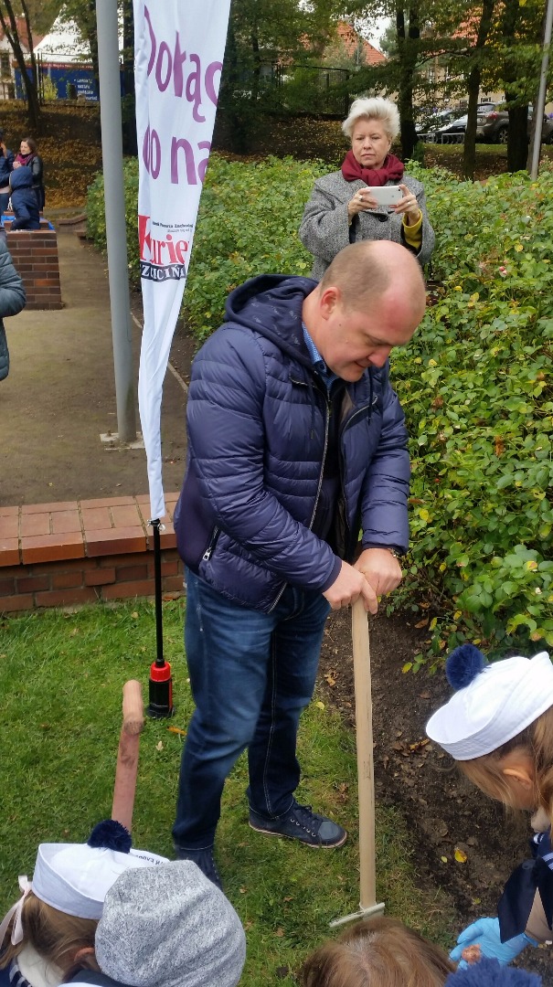 Sadzenie krokusów trwa na dobre. Pierwsze cebulki posadzili prezydent Szczecina Piotr Krzystek, przewodnicząca RO Arkońskie-Niemierzyn Maria Myśliwiec oraz dzieci z ośrodka Saniga