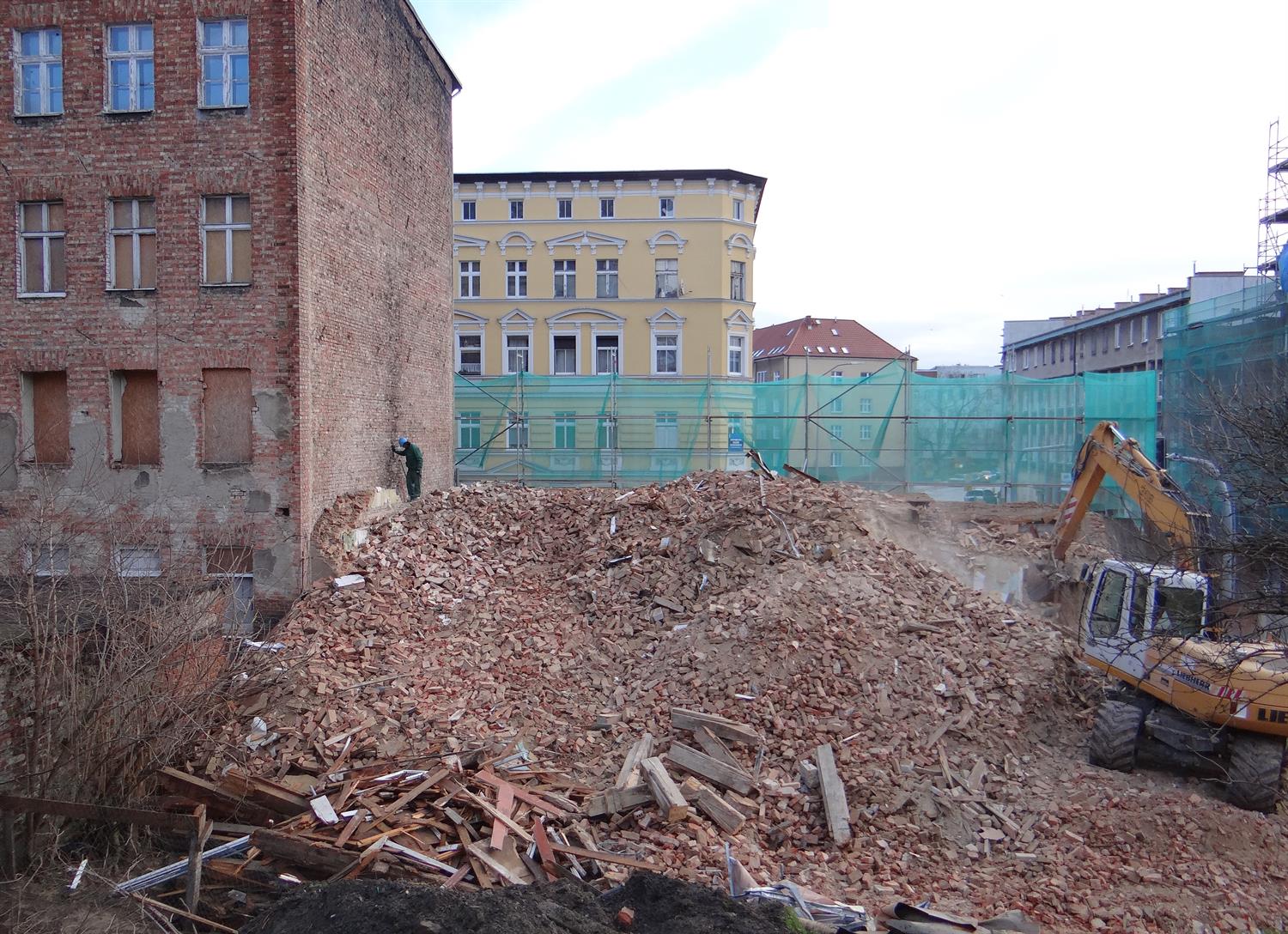 Cegła po cegle znika pierwsza z kamienic u zbiegu ulic Zygmunta Krasińskiego i Niemierzyńskiej. Chodzi o tę przy ul. Zygmunta Krasińskiego 97. W ubiegłym tygodniu urobek z niej nadal ładowany był przez koparkę na wywrotkę i wywożony. Stały jeszcze kikuty ścian frontowej i szczytowej. I jak na razie to jedyny z budynków, którego wyburzenie dokona się do końca tego roku. Mimo że do 20 grudnia miały zniknąć z pejzażu tej części Niebuszewa-Bolinka także te stojące po sąsiedzku i jeden przy ul. Niemierzyńskiej.