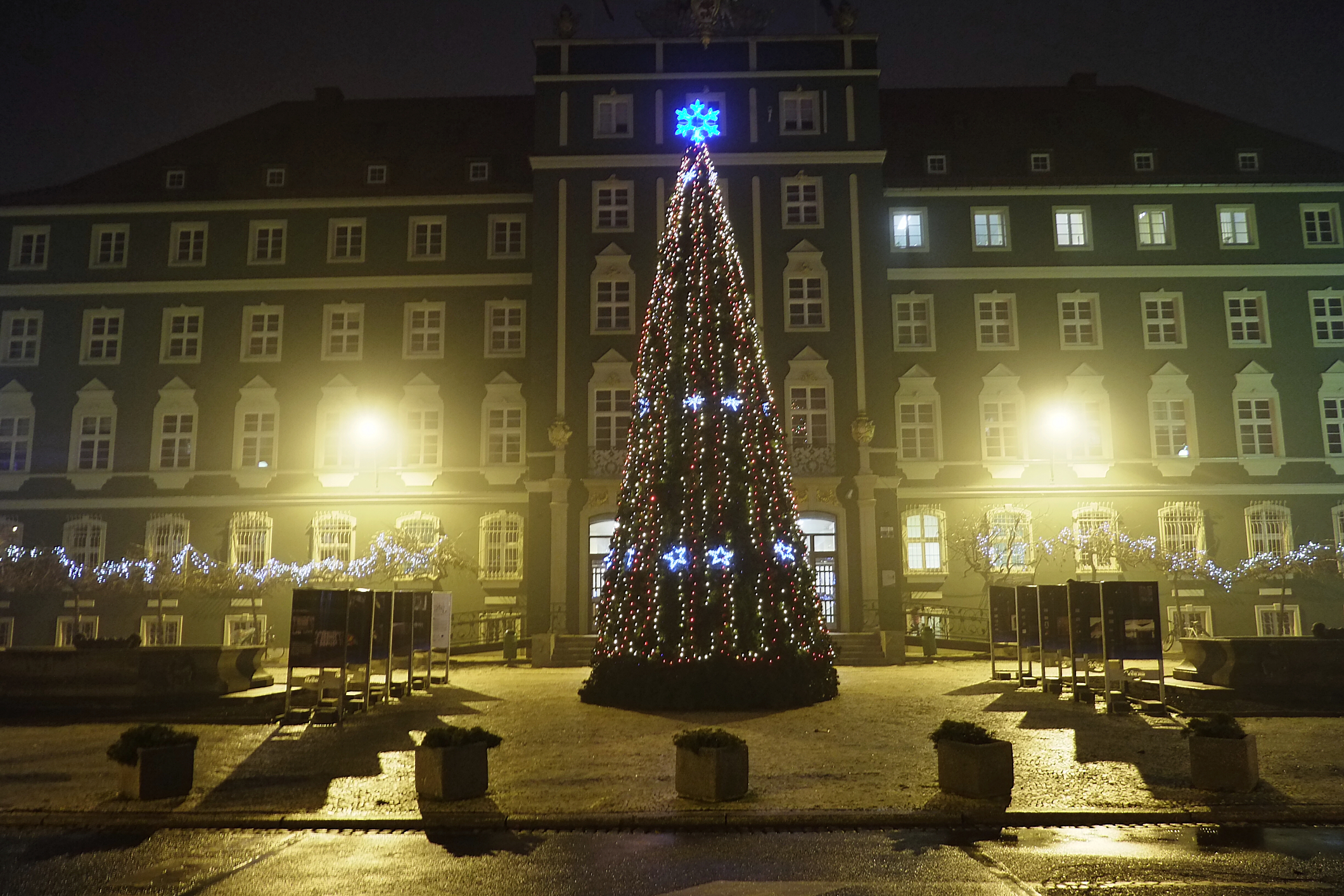 Ozdoby świąteczne znajdują się także na drzewach przed głównym wejściem do magistratu i nad przejazdami.