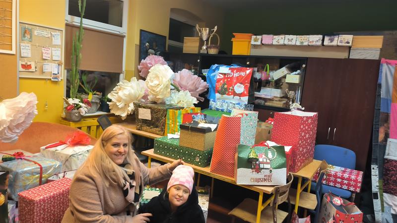 Swoją paczkę dostarczyły m.in. pani Iwona z córką Mają. Wcześniej, jak widać, dotarło tu z pakunkami wiele innych osób. Fot. Agnieszka SPIRYDOWICZ
