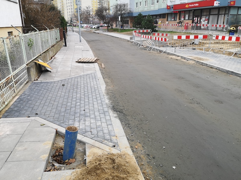 Chodnik został rozgrzebany na całej długości ulicy ponad pół roku temu, a od ponad miesiąca nic się tam nie dzieje. Wszędzie walają się porozrzucane barierki, porzucone płyty chodnikowe i elementy odzieży robotników, a gdzieniegdzie brakuje kostki brukowej. Do tego ubita ziemia zamieniła się w błoto. Nie można przejść z jednej strony ulicy na drugą. Jeden wielki syf. Ktoś powinien za to grubo beknąć.