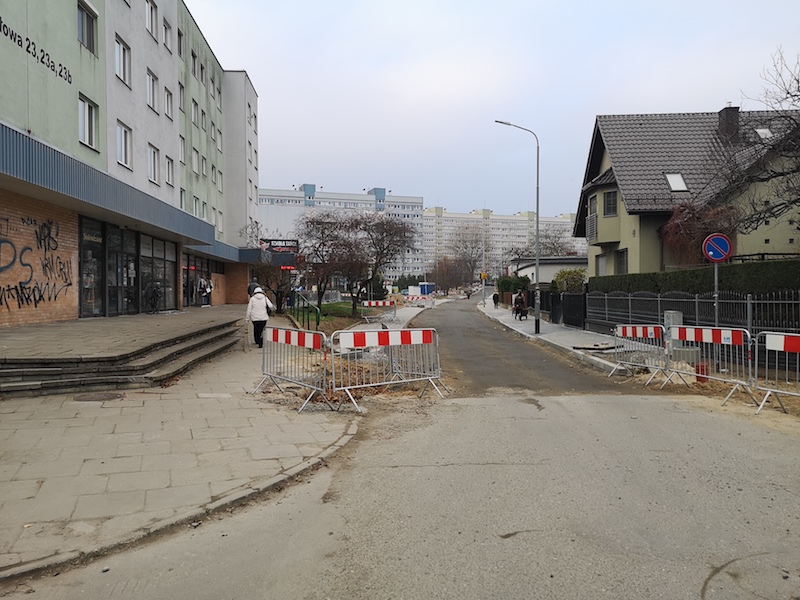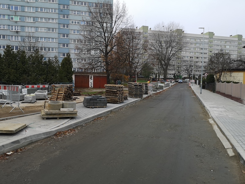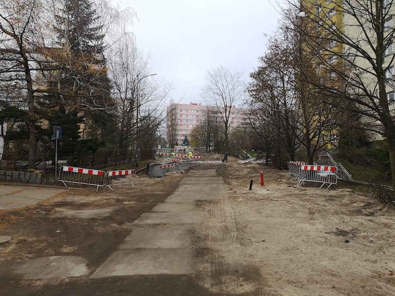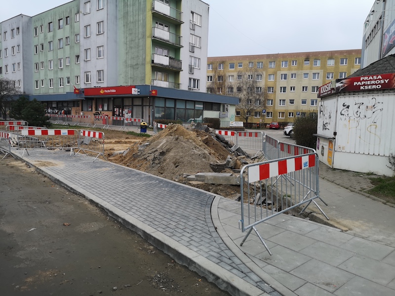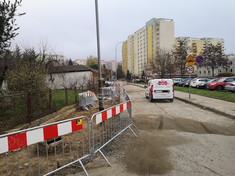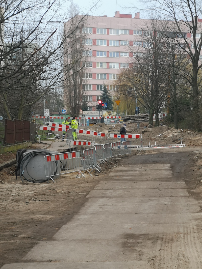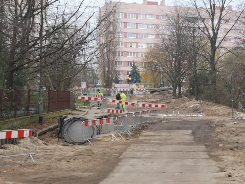 Drugim zamawiającym był Zarząd Dróg i Transportu Miejskiego, który odpowiada za prace drogowe. Hanna Pieczyńska z ZDiTM powiedziała, że wykonawca ma termin do końca czerwca przyszłego roku. Na placu budowy od wielu tygodni jednak nic się nie dzieje. W środę, kiedy odwiedziłem plac budowy, było na niej dwóch robotników, którzy ustawiali barierki. Jak się dowiedziałem, wykonawca robót firma BLEJKAN zabrała wszystkich robotników i sprzęt na inną budowę. Po moich telefonach w czwartek pojawili się na Jodłowej (koło Santockiej) robotnicy, ale na jak długo?