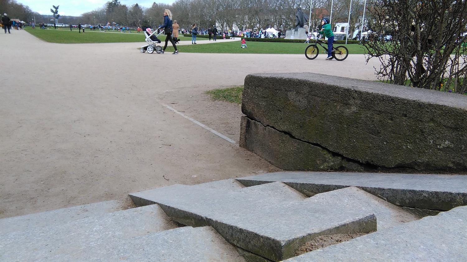 To miały być bezpieczne schody, ułatwiające przejazd wózkom i rowerom. Niestety, niemal wszystkie prowadzące na główną płytę Jasnych Błoni… się rozjechały. Opadły płyty ułożone na zjazdach. W efekcie czego stałe powiększa się szpara pomiędzy górnym stopniem a pozostałymi. Gdy w jednych miejscach sięga centymetra, to przy innych zejściach – jak widoczne na zdjęciu, od strony magistratu – ponad 5 cm. To usterka, która nie tylko fatalnie wygląda, tym bardziej w miejscu tak szczególnym jak plenerowy salon Szczecina, ale również może doprowadzić do poważnego wypadku. Polecamy uwadze Zakładu Usług Komunalnych owe potencjalnie niebezpieczne schody.