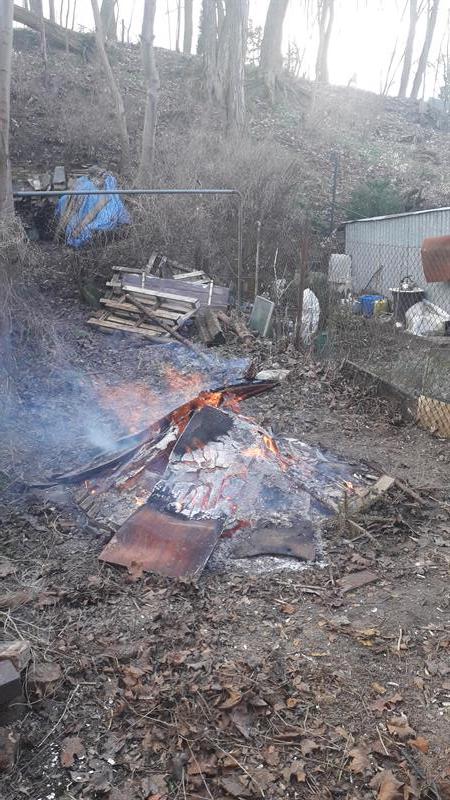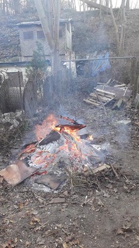 Na miejscu okazało się, że zgłoszenie jest jak najbardziej zasadne. W małym przydomowym ogródku usytuowanym na tyłach posesji, było rozpalone ognisko z różnego rodzaju lakierowanych płyt i desek z farbą. Płomień był znacznych rozmiarów i ze względu na panujące warunki atmosferyczne, czyli dość mocno wiejący wiatr, niebezpiecznie przechylał się w kierunku sąsiedniej posesji – w pobliżu ogniska był płot, porastający go suchy bluszcz, a za płotem drewniane szopy.