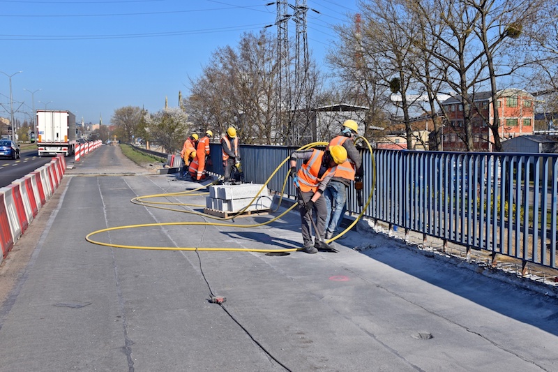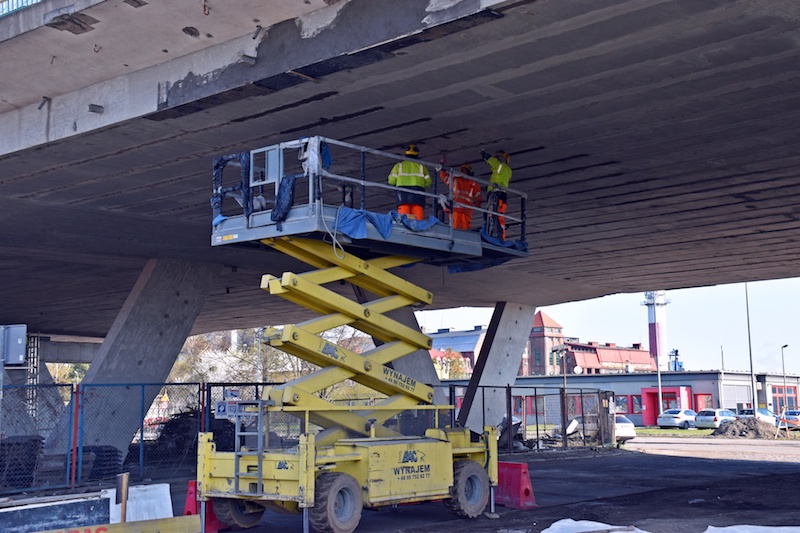 Jednocześnie pod obiektem estakady prowadzone są prace związane z wykonaniem nowych filarów. Prowadzony jest montaż łożysk; trwa prefabrykacja i betonowanie oczepu jednego z filarów. Ponadto wykonawca realizuje prace związane z uzupełnianiem ubytków betonu zaprawami naprawczymi i piaskowaniem powierzchni betonowej.