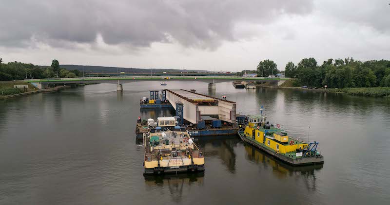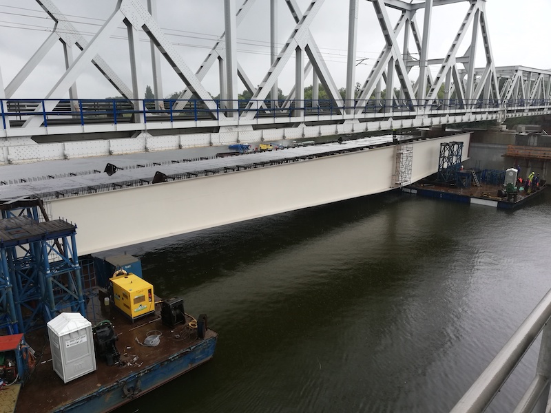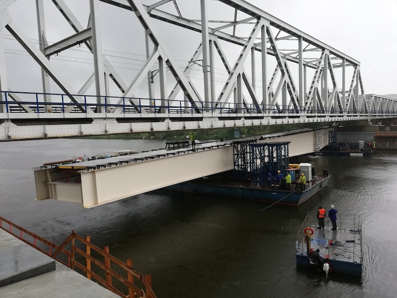 - Montaż konstrukcji mostu potrwa kilkanaście dni. Po dopłynięciu na miejsce montażu, pierwszy segment zostanie podniesiony na docelową wysokość i ustawiony przy przyczółku oraz jednym z filarów. Do zamontowania są trzy przęsła obiektu. Po ich montażu rozpocznie się scalanie całej konstrukcji - opisuje zaplanowany harmonogram prac P. Zieliński.