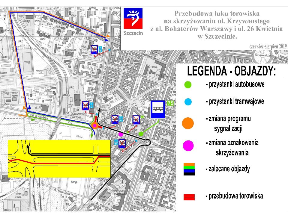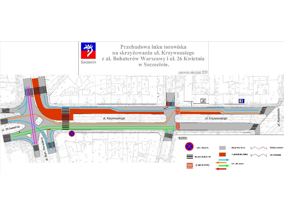 Przejazd odcinka ul. Krzywoustego pomiędzy ul. Bolesława Śmiałego, a skrzyżowaniem z al. Bohaterów Warszawy i ul. 26 Kwietnia dla pojazdów zmierzających w stronę Os. Przyjaźni odbywać się będzie na jezdni południowej „pod prąd” jednym pasem ruchu wzdłuż obszaru międzyjezdnego. Przejazd pojazdów zmierzających na relacji prawoskrętnej Krzywoustego-Bohaterów Warszawy pozostanie utrzymany.