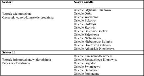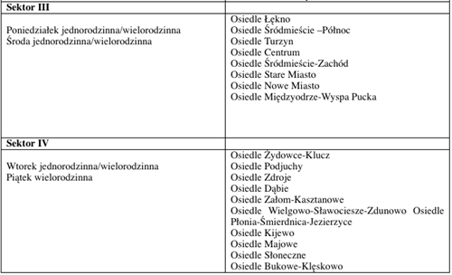Odbiór drzewek odbywać się będzie raz w tygodniu w zabudowie jednorodzinnej oraz dwa razy w tygodniu w zabudowie wielorodzinnej. Harmonogram odbiorów na poszczególnych osiedlach zawarty jest w załączonej tabeli.