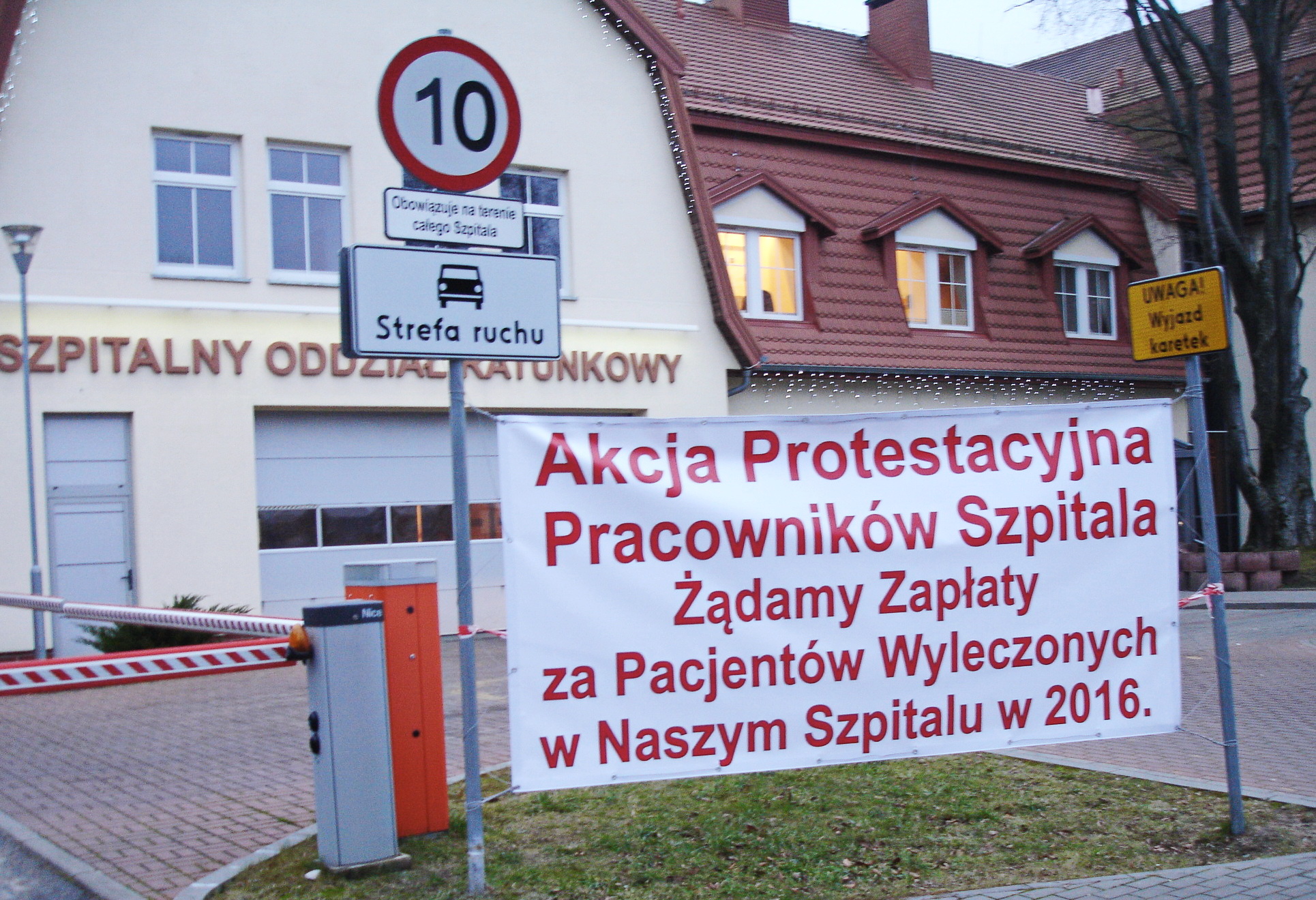 Na zdjęciu: w okolicy Szpitalnego Oddziału Ratunkowego witaczem dla przybyłych jest tablica o akcji protestacyjnej pracowników lecznicy.
