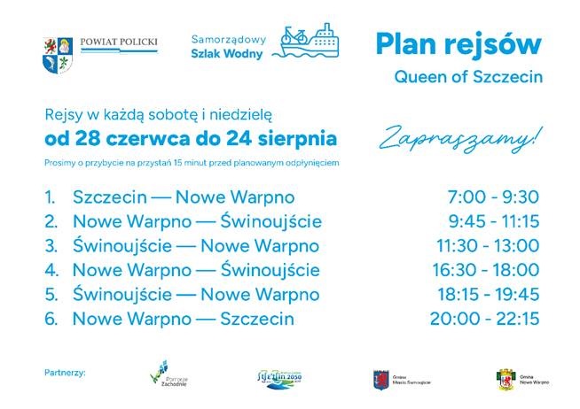 - Już od 28 czerwca do 24 sierpnia, w każdą sobotę i niedzielę, będzie można wyruszyć w rejs statkiem Queen of Szczecin, by odkrywać uroki Pomorza Zachodniego z zupełnie nowej perspektywy – od strony wody - informuje Sylwia Turkiewicz, rzeczniczka Starostwa Powiatowego w Policach.