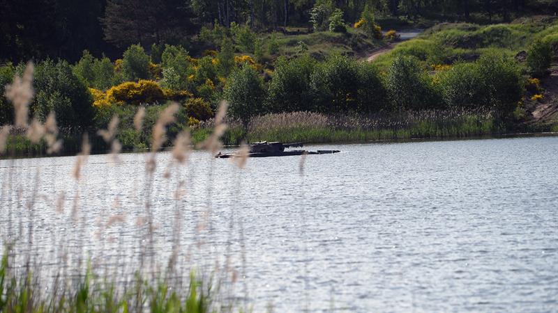Mariusz Błaszczak oglądał wspólne szkolenie polsko-amerykańskich żołnierzy, którzy pokonywali przeszkodę wodną na jeziorze Zły Łęg.