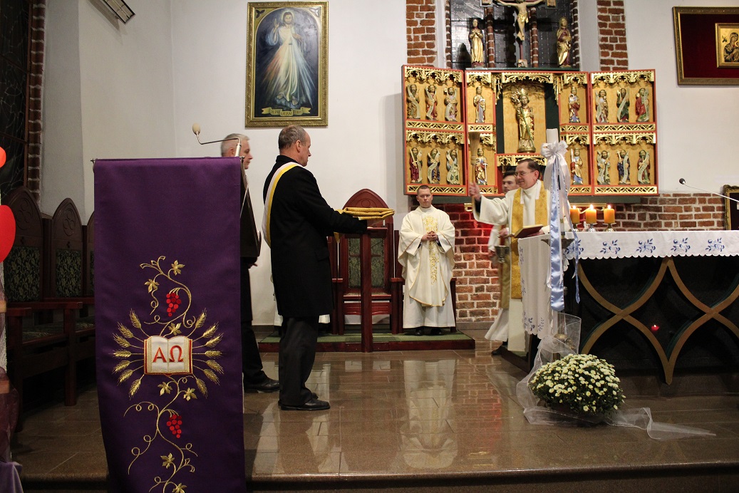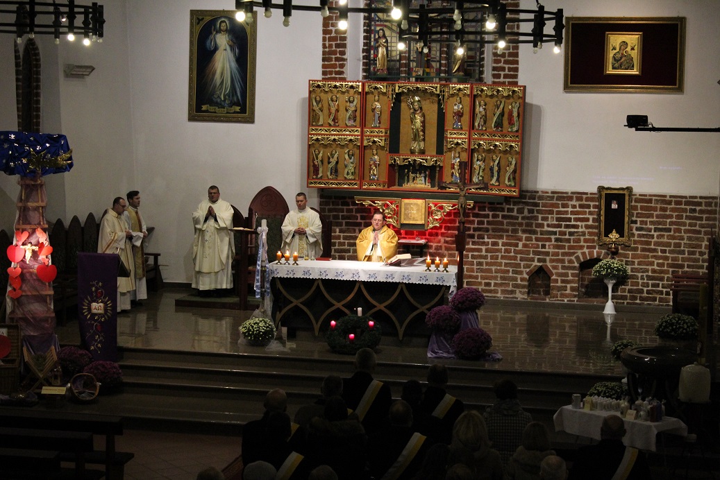Rocznicowej koncelebrze sprawowanej w intencji wszystkich rycerzy, szczególnie tych z pyrzyckiej rady oraz ich rodzin przewodniczył kapelan rady ks. kan. dr Grzegorz Harasimiak. Na jego ręce przed rozpoczęciem liturgii został przekazany ufundowany przez członków ornat z symbolami organizacji. – Dziękuję za tę radość, którą wy stwarzacie dla wielu osób, za wasze inicjatywy, myślę, że także i przykład dla waszych rodzin. – mówił w czasie Mszy Świętej do zebranych ksiądz kapelan.