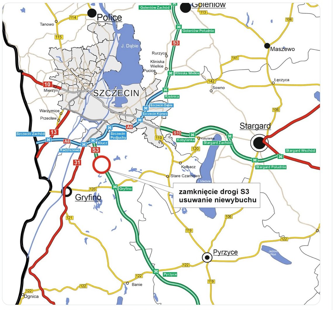 Na czas usuwania niewybuchu z II wojny światowej w piątek od godz. 8.30 do 12.00 droga S3 między węzłem Gryfino a węzłem Szczecin-Klucz będzie zamknięta. GDDKiA poinformowała o utrudnieniach i wyznaczyła objazdy.