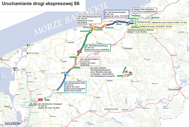 Jako pierwszy, w maju tego roku, do ruchu został oddany odcinek łączący drogę S3 w rejonie Goleniowa z obwodnicą Nowogardu. Na odcinku Nowogard-Płoty od sierpnia jedziemy już nową S6, na razie jeszcze jedną jezdnią. Kolejne dwa odcinki zostały oddane do ruchu 30 września, były to łączące Płoty z Kołobrzegiem.