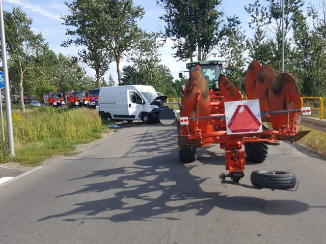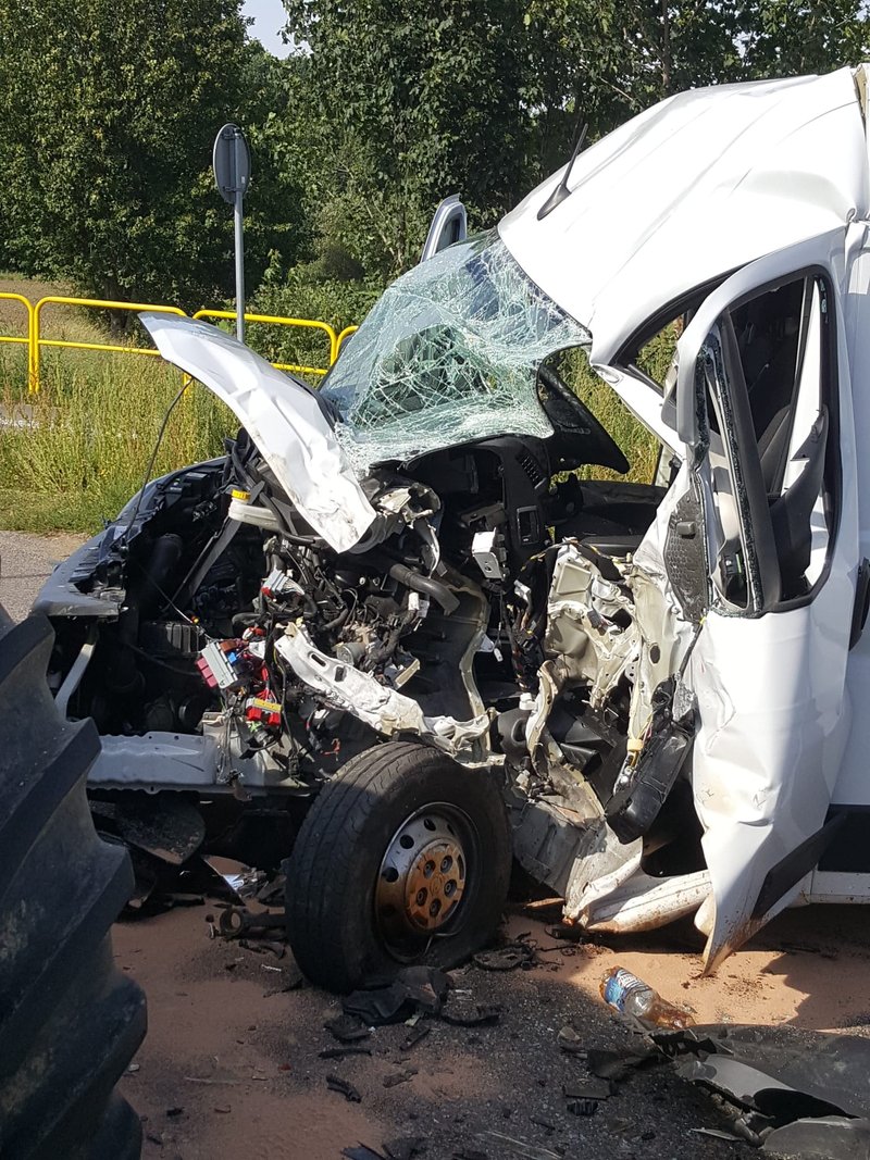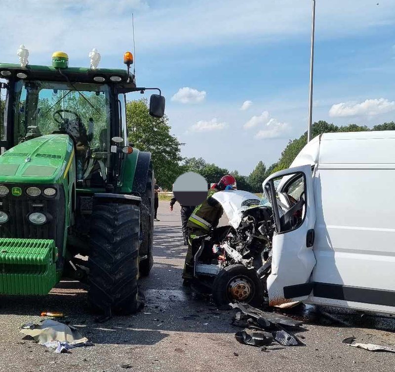 Samochód dostawczy uderzył tam w rolniczy ciągnik. Przód auta został całkowicie rozbity.