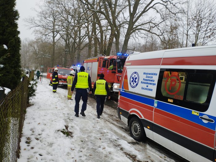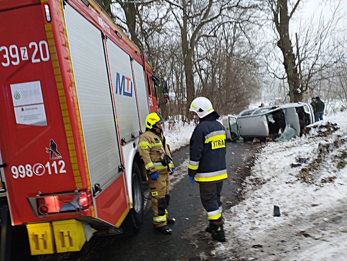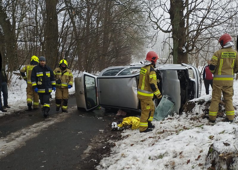 Do groźnego wypadku doszło w sobotę w miejscowości Rosowo (powiat stargardzki). Na częściowo pokrytej śniegiem drodze samochód osobowy wpadł w poślizg i uderzył w drzewo. Auto następnie dachowało.