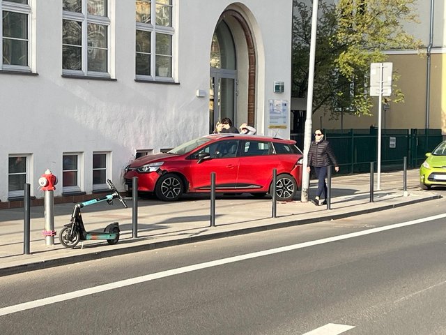 Tylko po co do zdjęcia ktoś z powrotem ustawił skoszony słupek? Pani parkowała wcześniej obok w zatoczce, więc to chyba jakiś "placykowy" manewr się nie udał